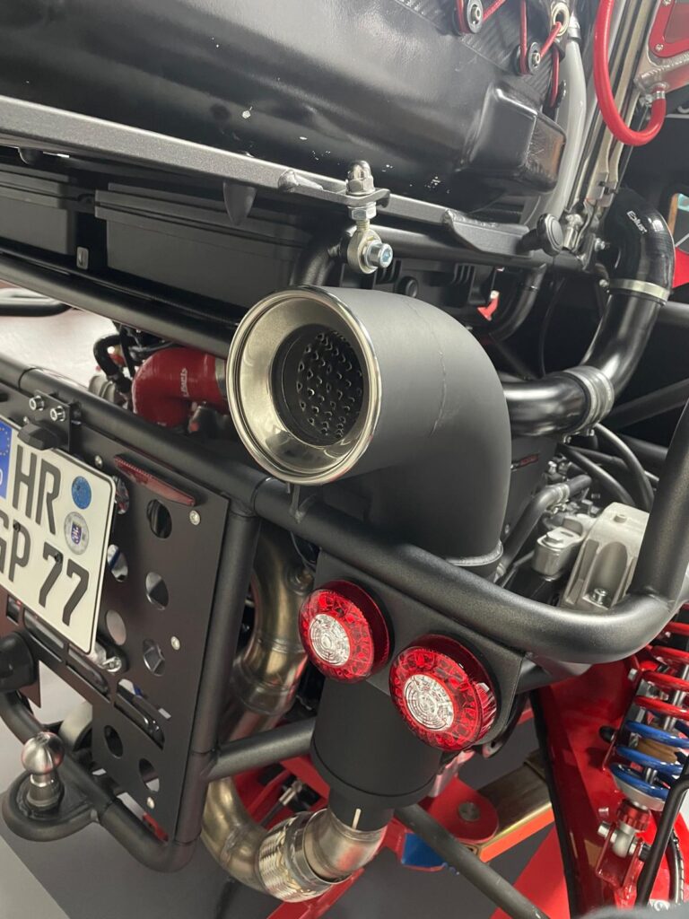 Der Endtopf ist vom Beschichter zurück. Meine Erwartung wurde voll erfüllt, der Endtopf ist nun mit einer Beschichtung aus eingebrannten Keramik Lack überzogen und wirkt sehr edel. Die Firma Menze hat hier top Arbeit geleistet. Ich habe bewußt am Bogen, den hinteren Teil in Edelstahl Glanz gelassen um einen Kontrast zu haben zwischen dem matten/schwarz…