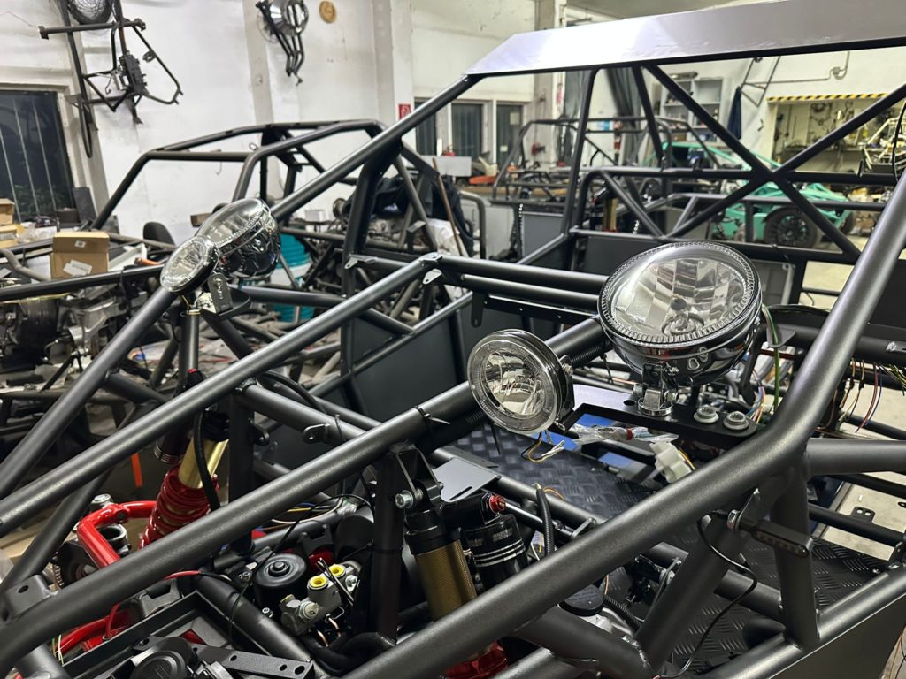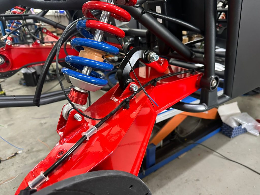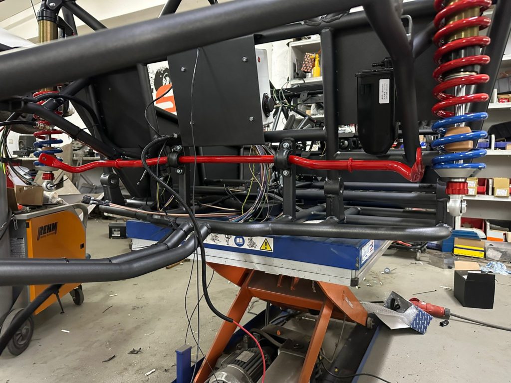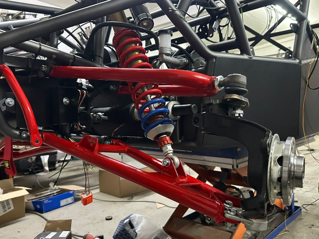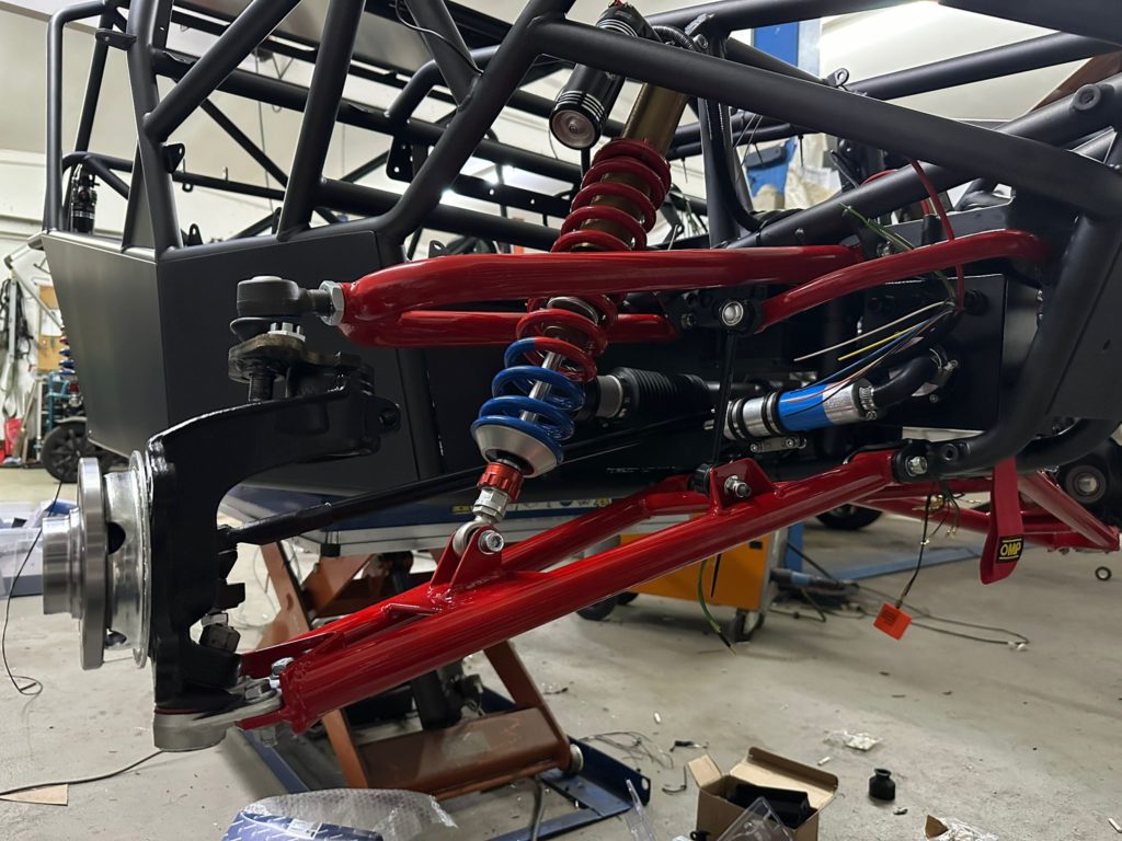 Die Kastenschwingen der HA und die A-Arms der VA mit den Bremsscheiben sind eingebaut, das sieht schon richtig nach einem coolen Buggy aus.