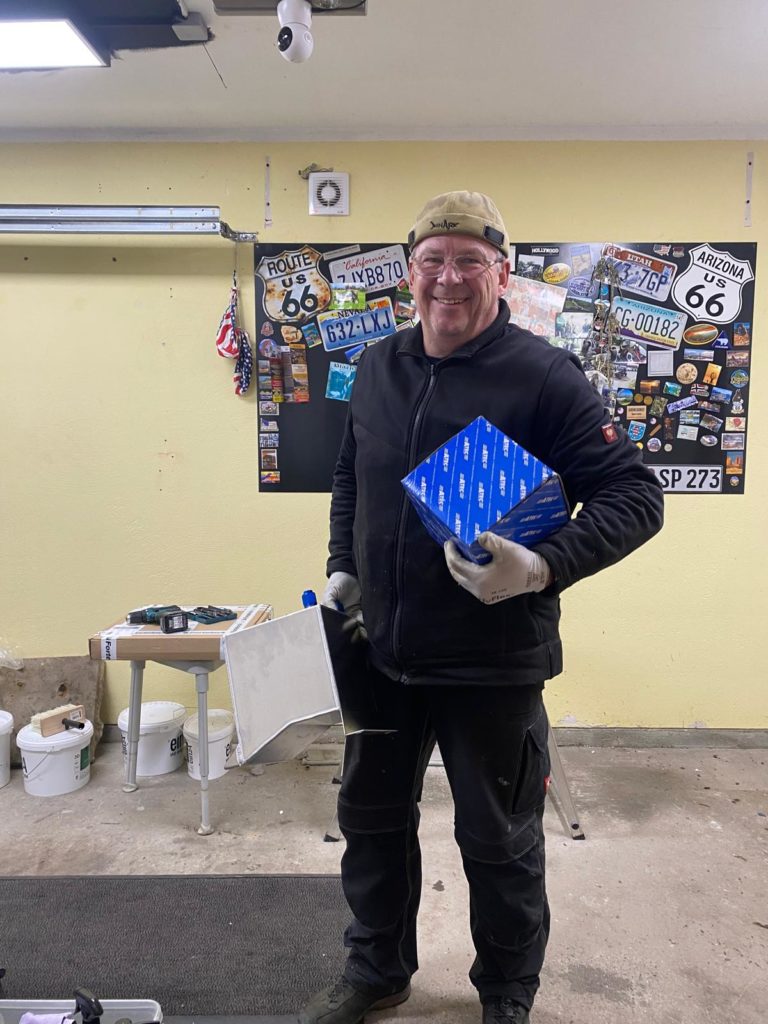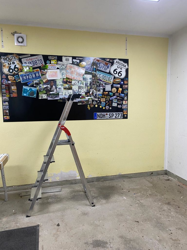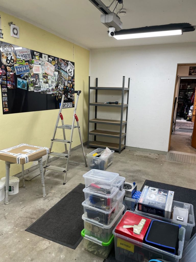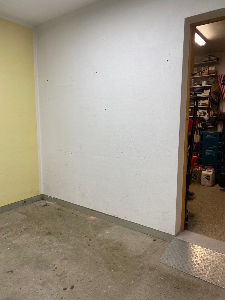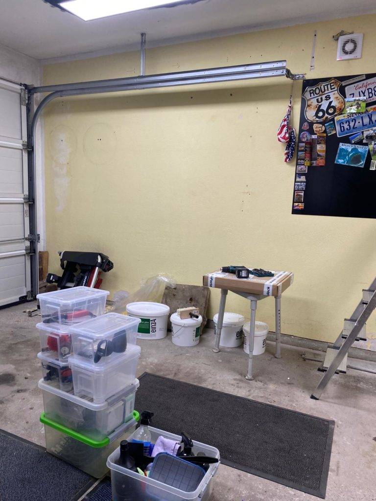 Wieder ein Schritt in der neuen Garage geschafft! Jetzt geht’s an die Malerarbeiten – erst noch Löcher zuspachteln, dann heißt es: Farbe frei!