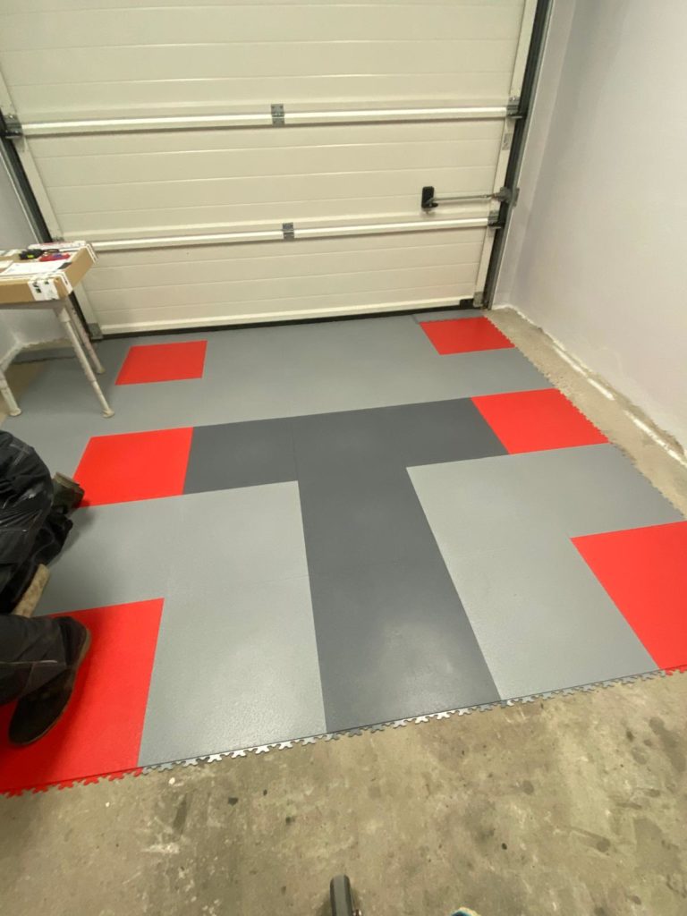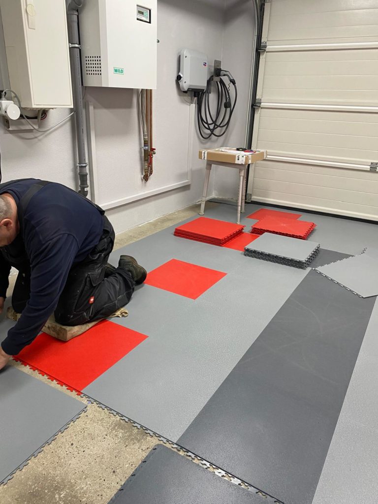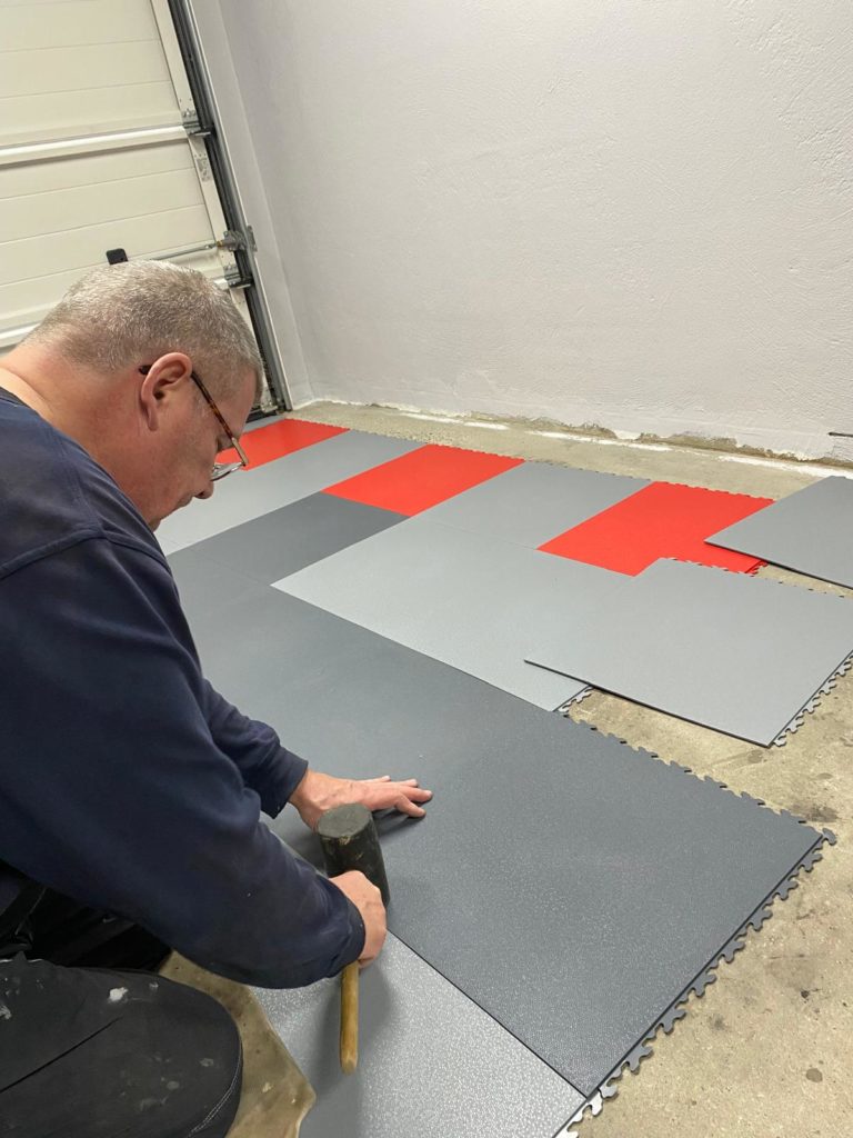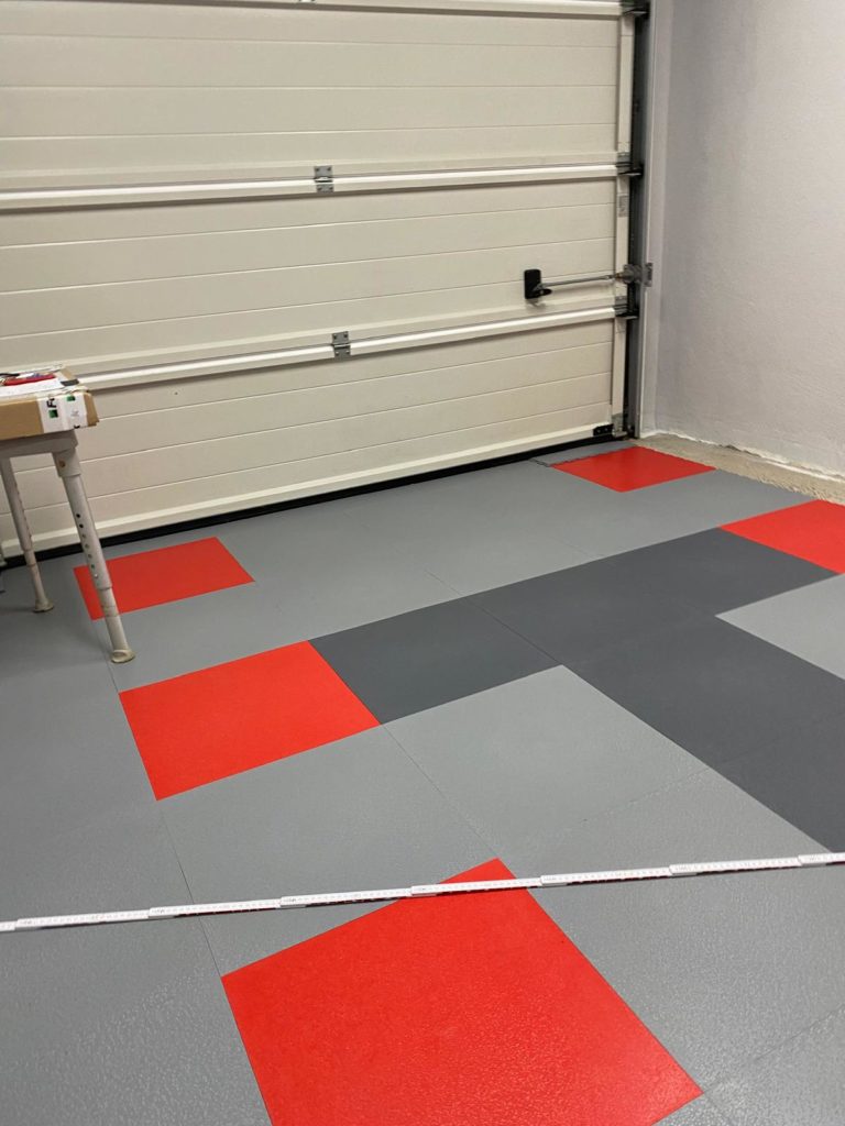 Heute ging es weiter mit dem Verlegen der Klickfliesen. Praktischerweise hatte ich zwölf dunkelgraue Fliesen mitgeschickt bekommen, die nun unter der Hebebühne ihren Platz finden sollen. Also habe ich kurzerhand zwei Reihen wieder abgebaut und das neue Muster verlegt.