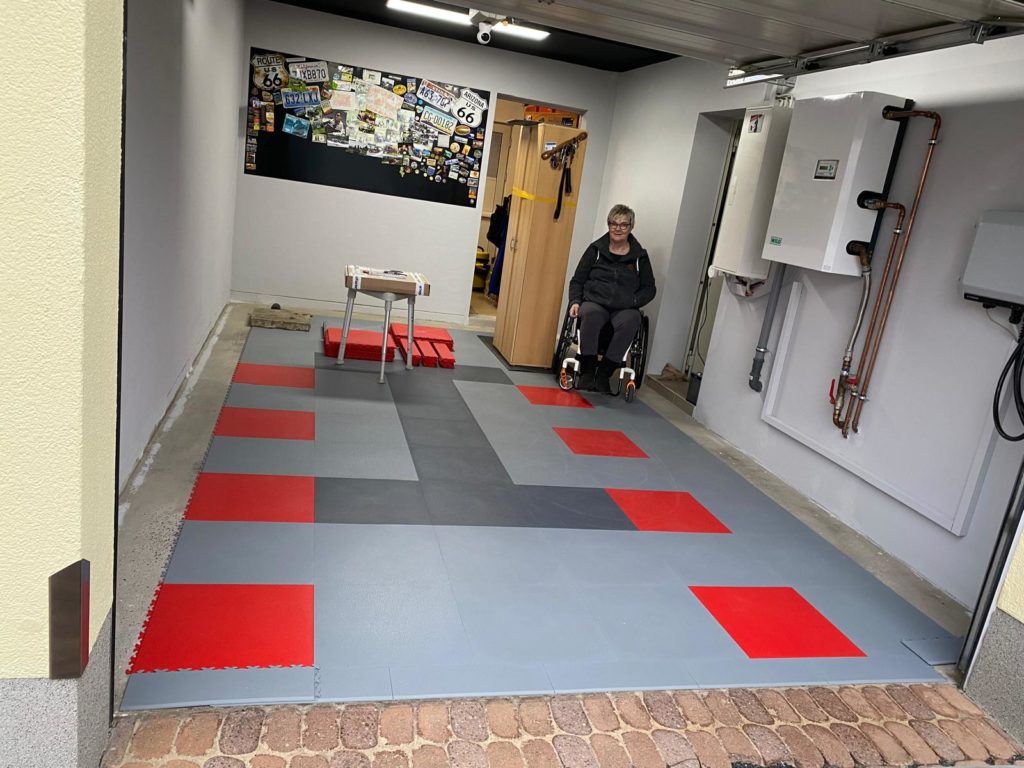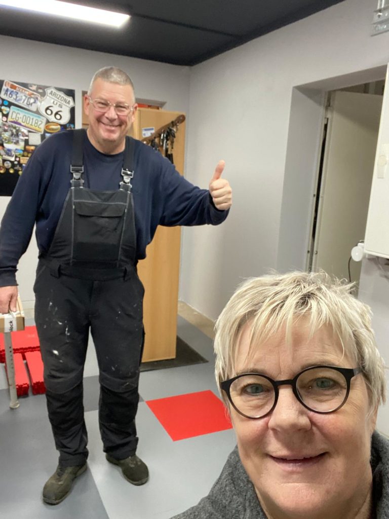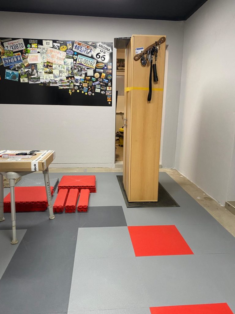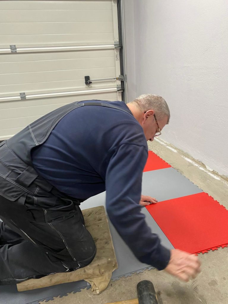 Heute ging es weiter mit dem Verlegen der Klickfliesen. Praktischerweise hatte ich zwölf dunkelgraue Fliesen mitgeschickt bekommen, die nun unter der Hebebühne ihren Platz finden sollen. Also habe ich kurzerhand zwei Reihen wieder abgebaut und das neue Muster verlegt.