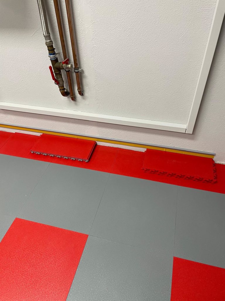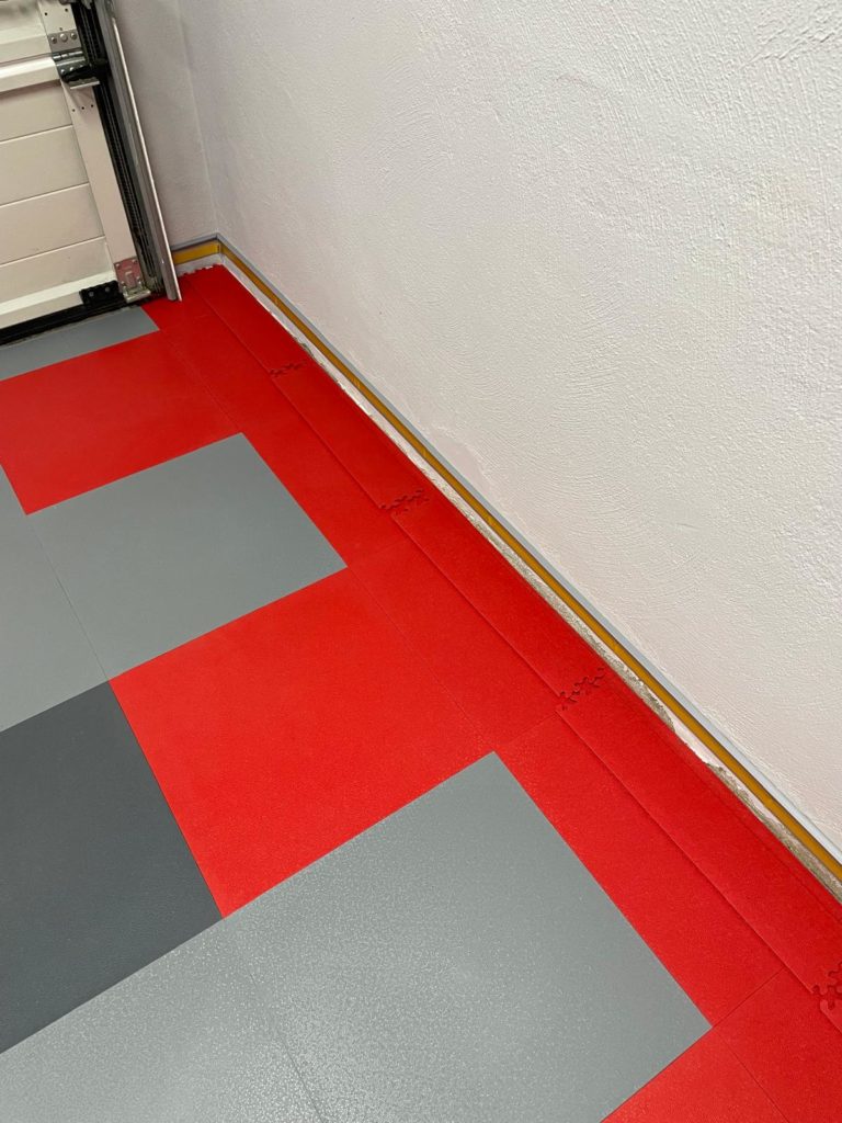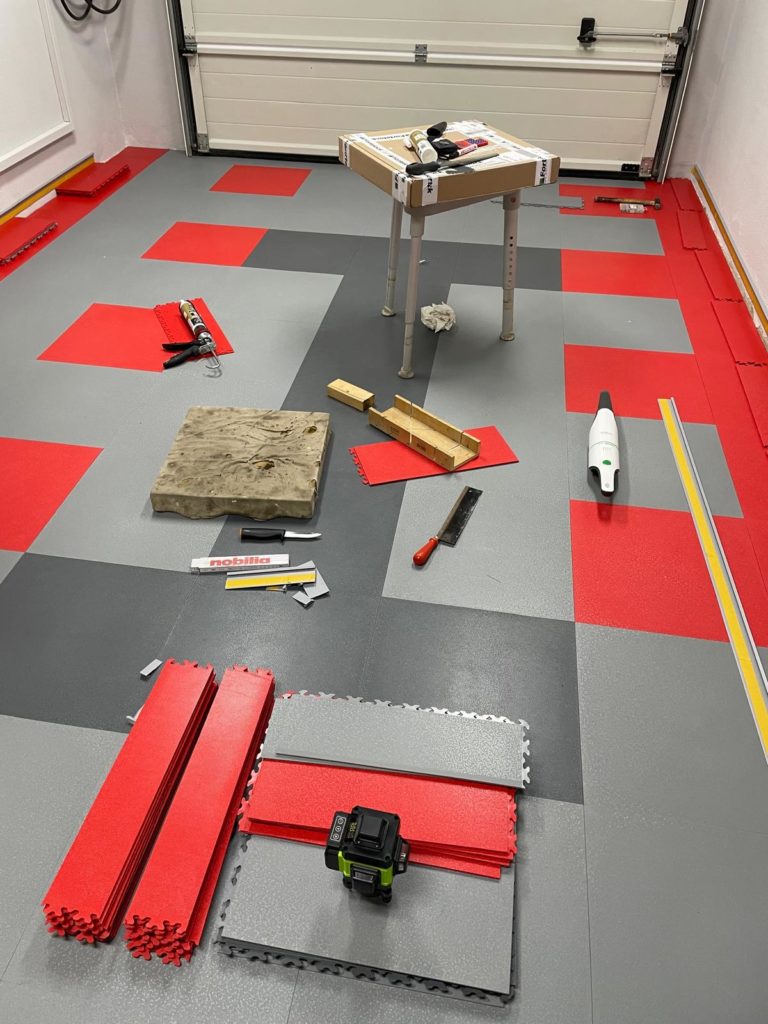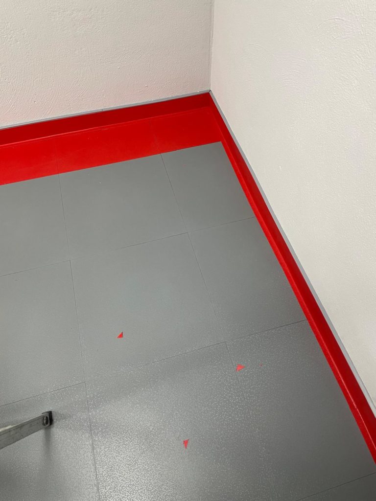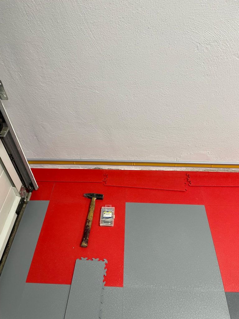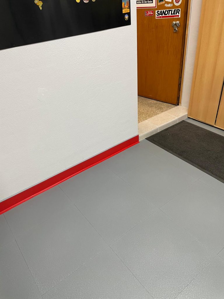 Der abschließende Schritt zur Fertigstellung des Bodenbelags war das Anbringen der Sockelleiste. Ich habe mich dabei an die Installationsanleitung gehalten: Fünf Platten übereinander ergeben exakt das Maß, um die Klickfliesen für die Sockelleiste zu befestigen. Ich klebte die Formleiste mit Spezialkleber an und ließ sie 24 Stunden aushärten.