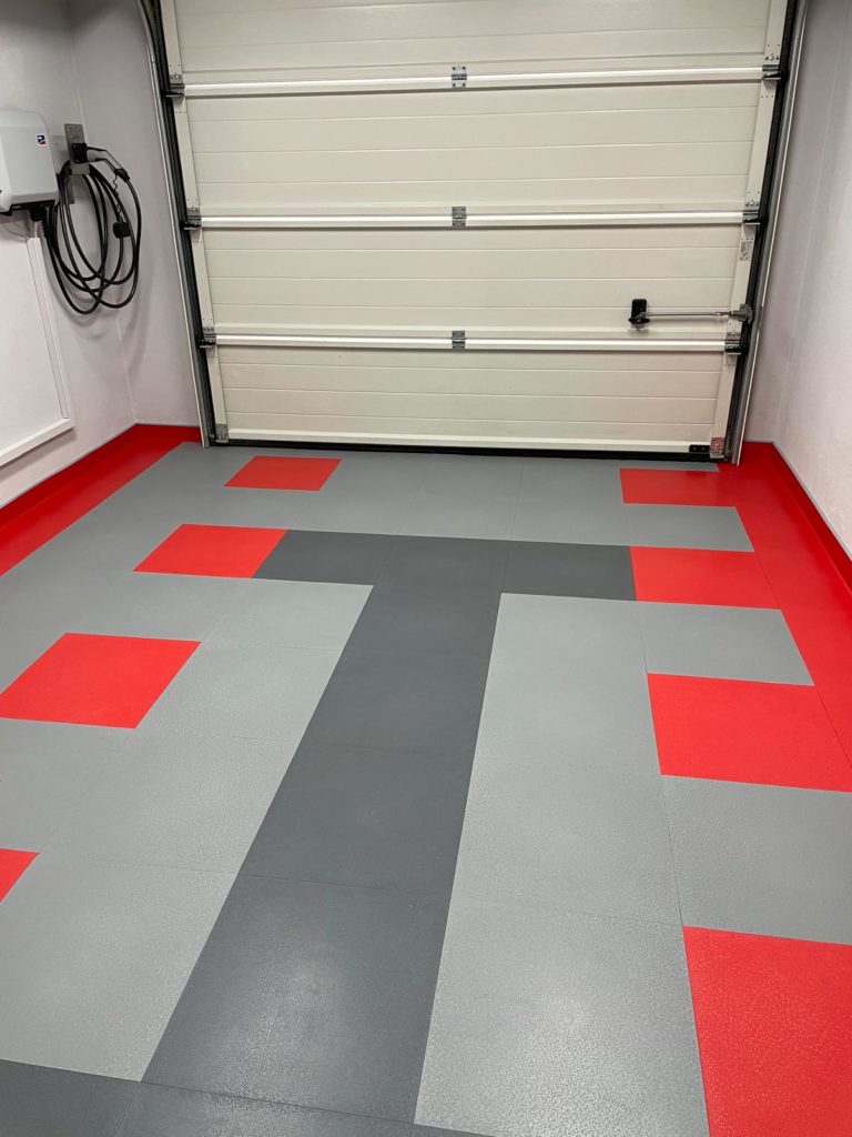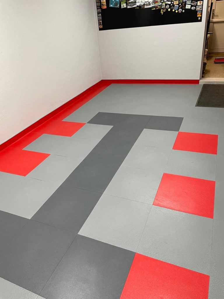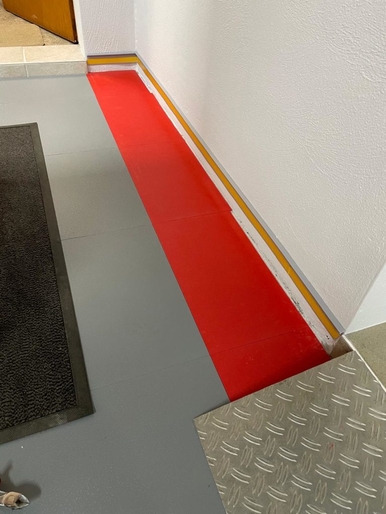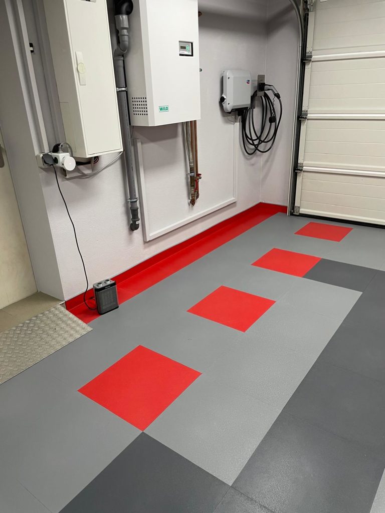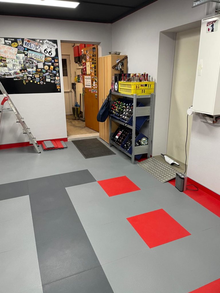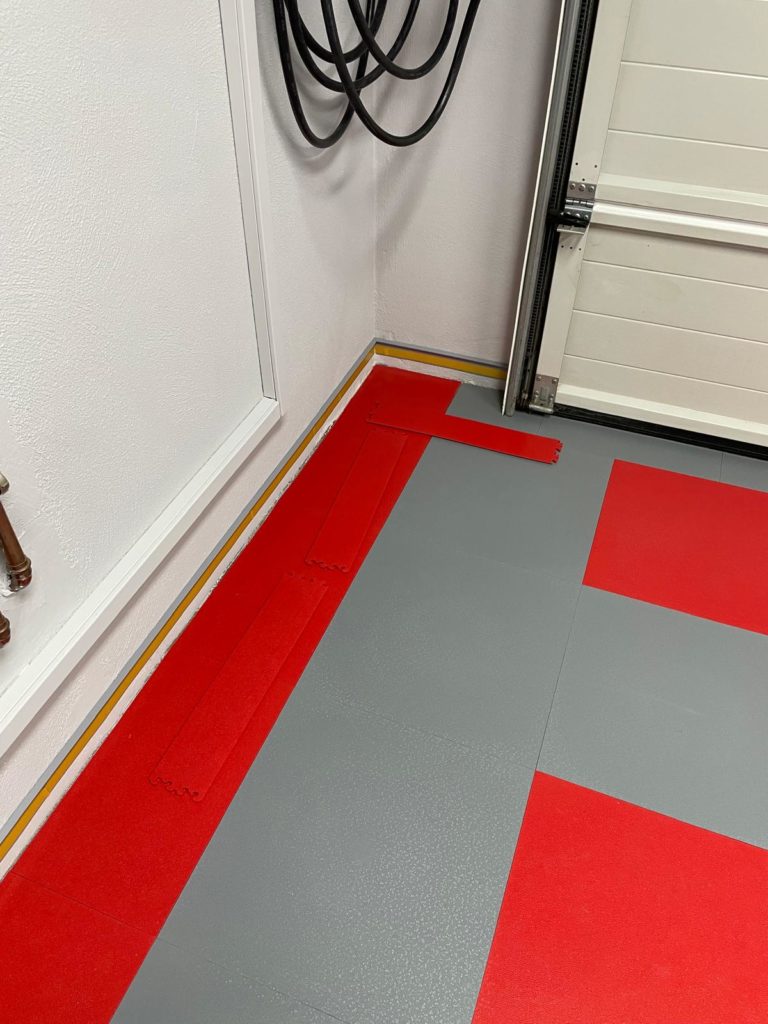 Der abschließende Schritt zur Fertigstellung des Bodenbelags war das Anbringen der Sockelleiste. Ich habe mich dabei an die Installationsanleitung gehalten: Fünf Platten übereinander ergeben exakt das Maß, um die Klickfliesen für die Sockelleiste zu befestigen. Ich klebte die Formleiste mit Spezialkleber an und ließ sie 24 Stunden aushärten.