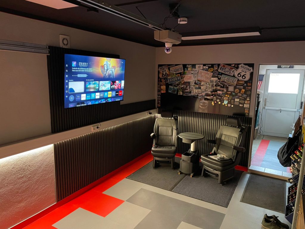 Um die abgegrenzte Fläche als Sitzgelegenheit nutzen zu können, habe ich Akustikpaneele aus dem Baumarkt gekauft und so verbaut, dass der Kabelkanal für die Versorgung mit Luft und Strom integriert wurde. Ein LED-TV rundet das Ganze ab, er ist für unterschiedliche Aufgaben vorgesehen.