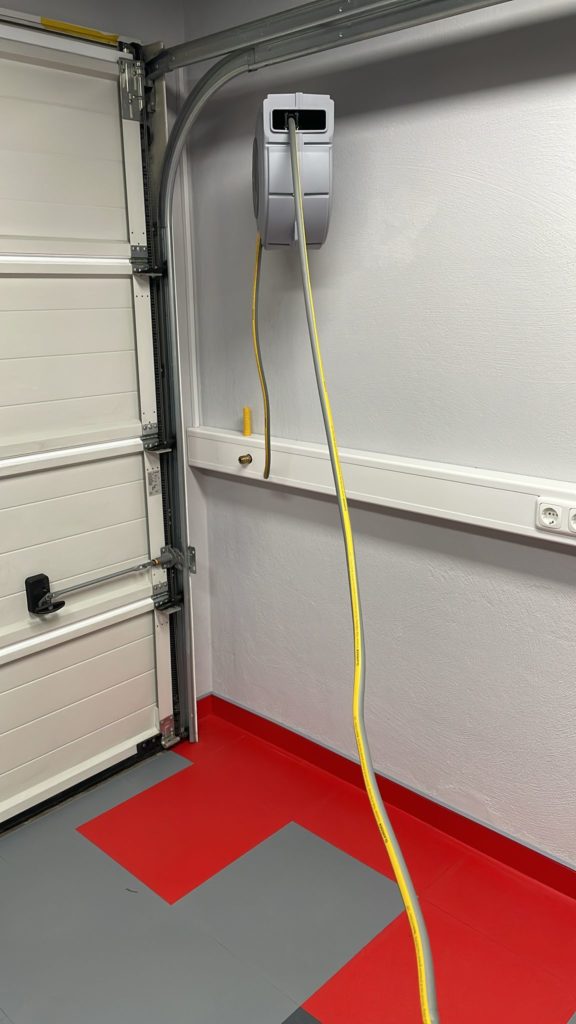 Die Aufrolltrommel ist montiert, und den Zugangsschlauch habe ich direkt gekürzt – 1,50 m waren nicht nötig. Morgen vercrimpe ich die Anschlusstülle, dann ist alles safe. Der Druckschlauch ist ca. 20 m lang und kann bis 12 bar Druck ab, für mich mehr als ausreichend.