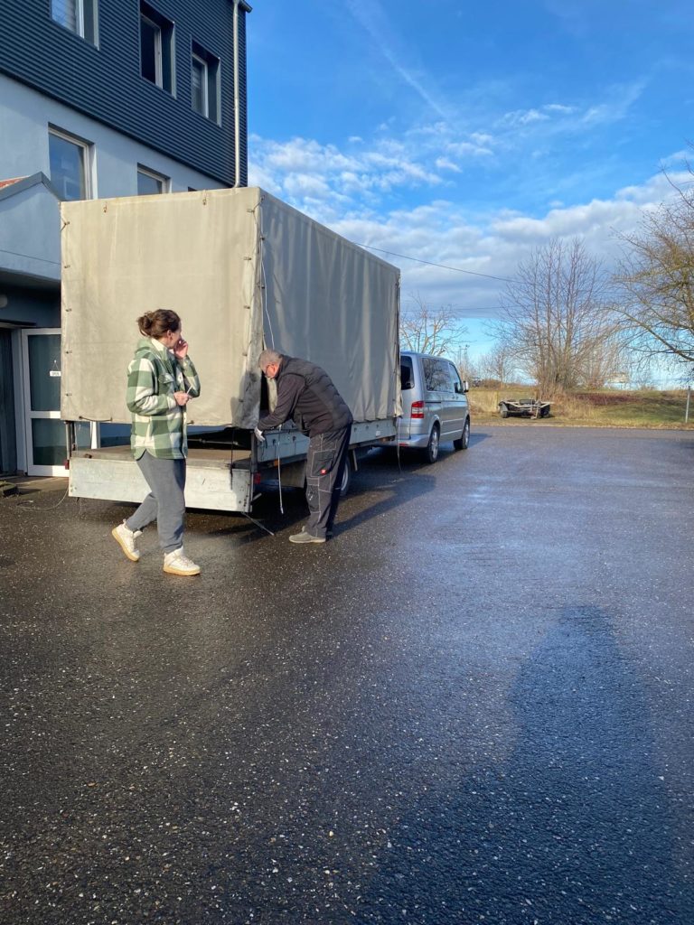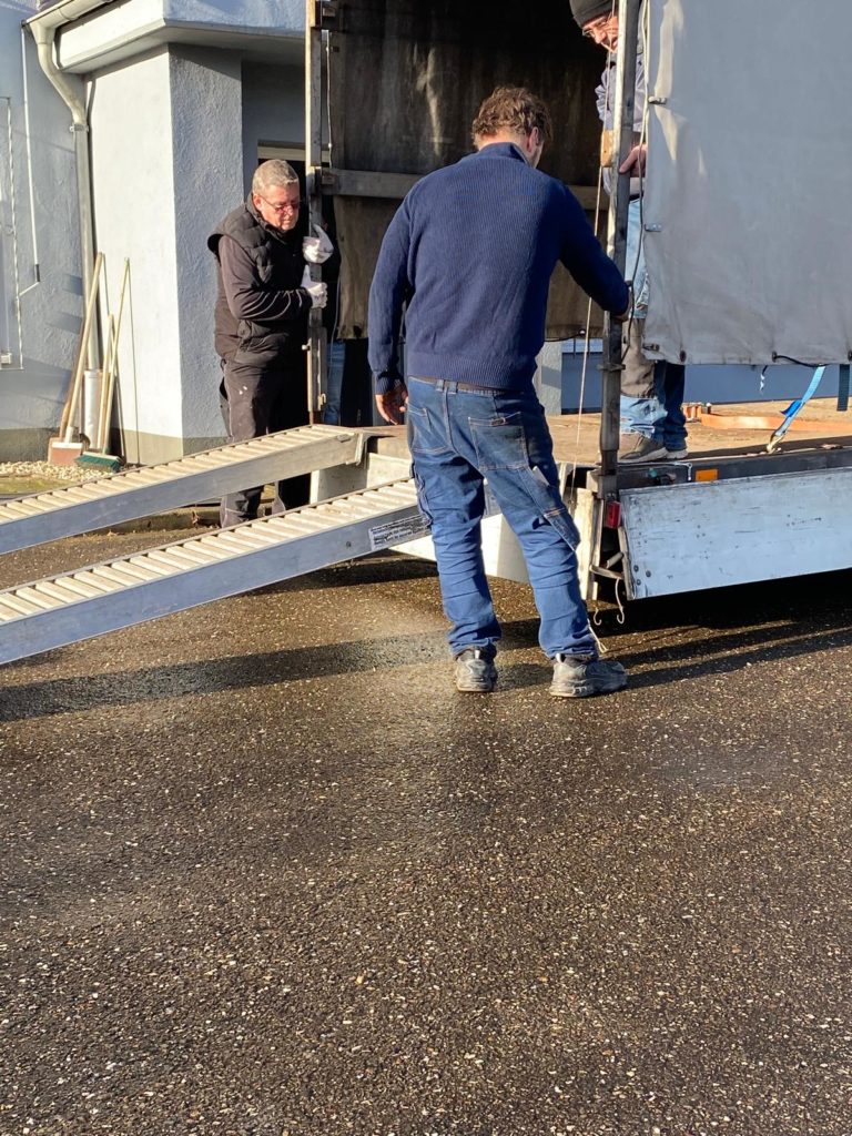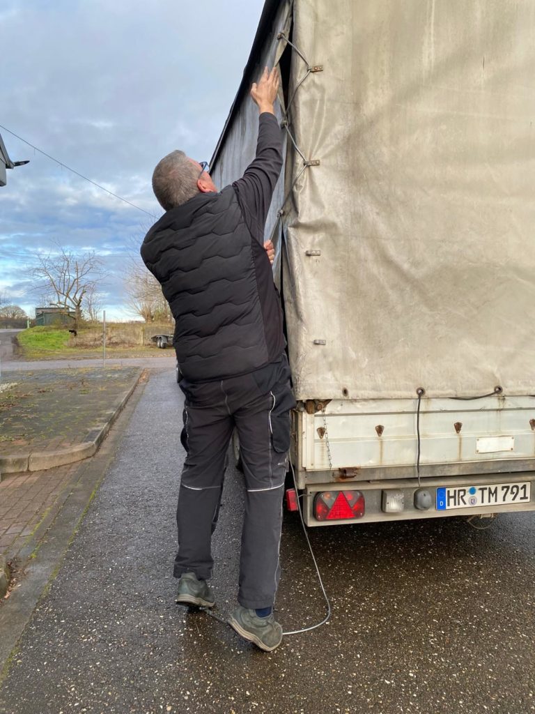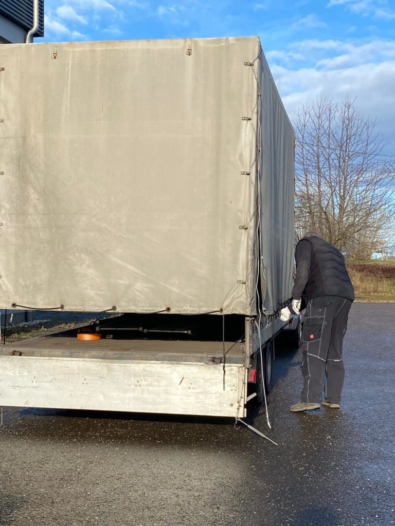 Heute Montag den 08.12.2025 sind wir gegen 9:00 Uhr gestartet und Richtung Weißenfels zu Mirko Busch gefahren. Die Fahrt verlief ruhig trotz des ungewohnt großen Planenhänger. Ca. 11:00 Uhr waren wir am Zielort wo wir schon erwartet wurden. Kurze Lagebesprechung und es ging an die Verladung.