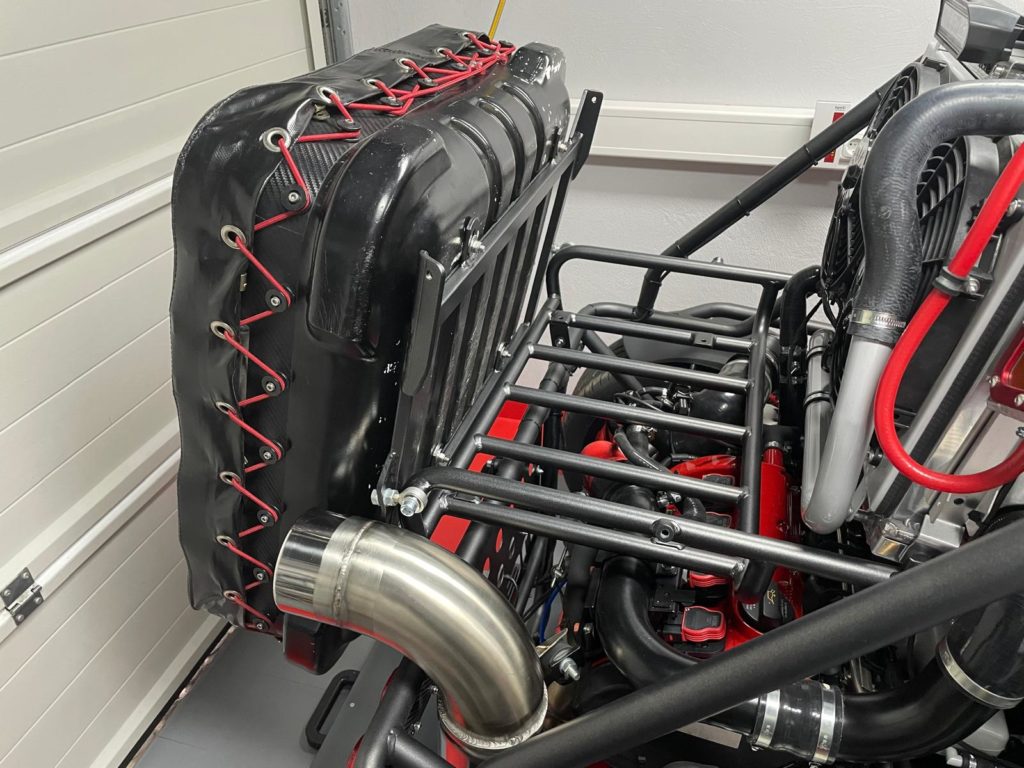 Der dritte Bestandteil ist das Halteblech. Dieses habe ich bewusst sehr stabil ausgeführt, um die auftretenden Kräfte gleichmäßig auf den Träger zu verteilen. Beim Umbau auf den neuen Träger war es entscheidend, das Halteblech zusammen mit der ersten Schale exakt zu positionieren. Die Box sollte optisch perfekt mittig sitzen und gleichzeitig genügend Raum für die Abluft des Kühlers lassen.