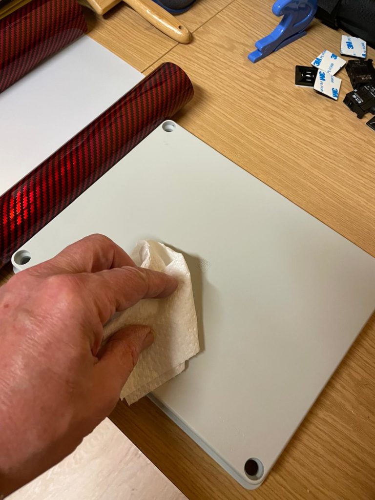 Ich habe den Deckel mit Silikonreiniger abgerieben und die Folie trocken verklebt. Mit einer Heißluftpistole dann vorsichtig die Ecken erwärmt und foliert.