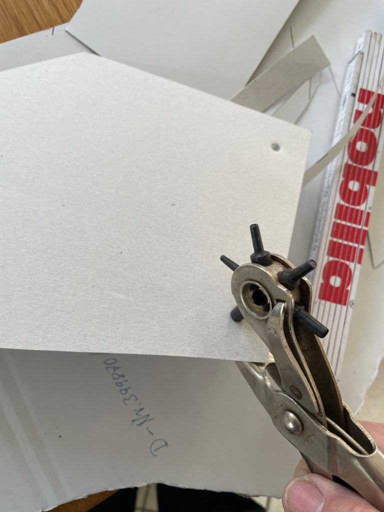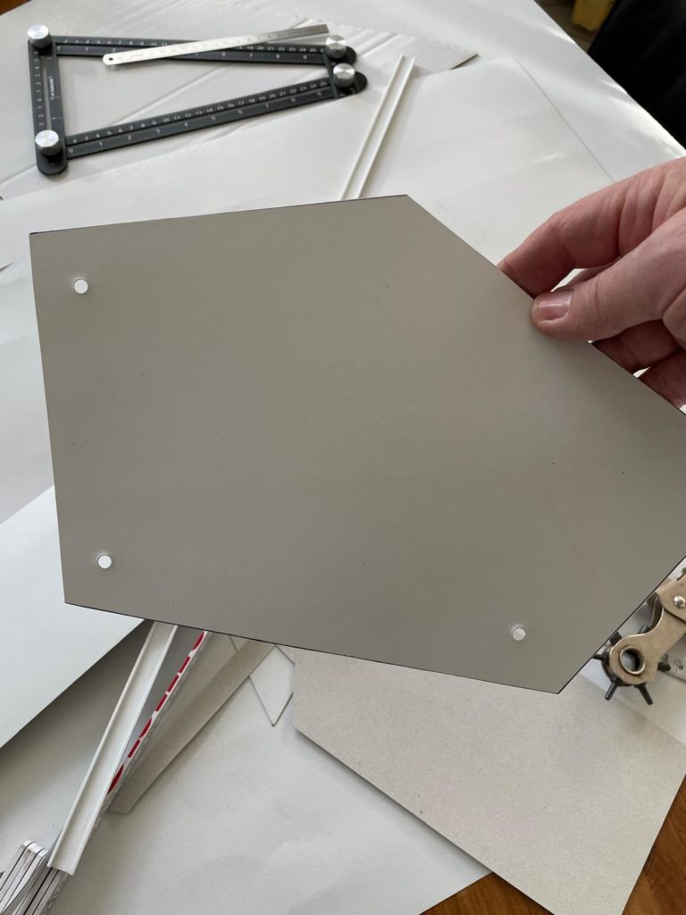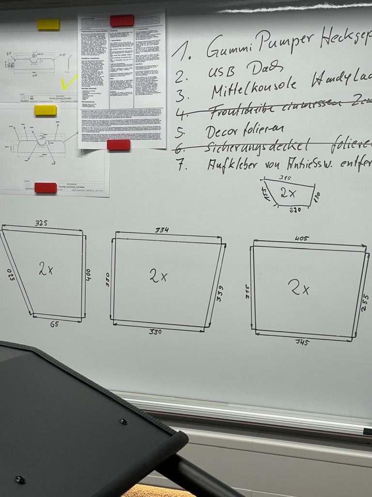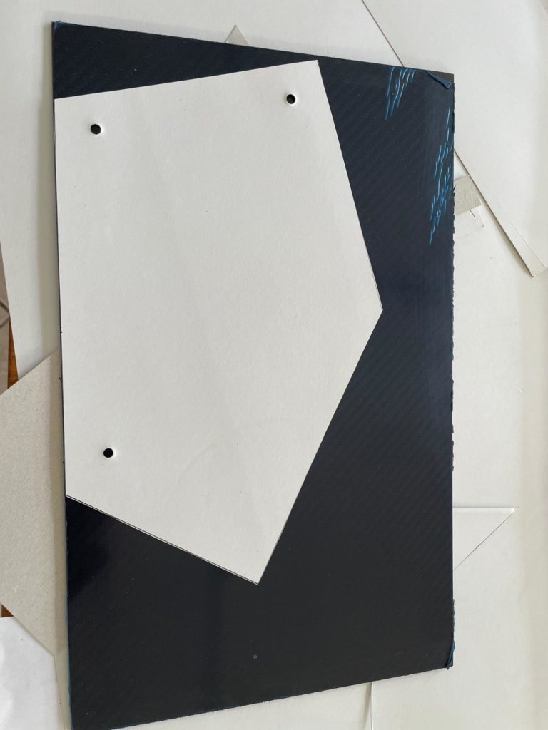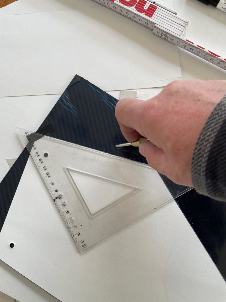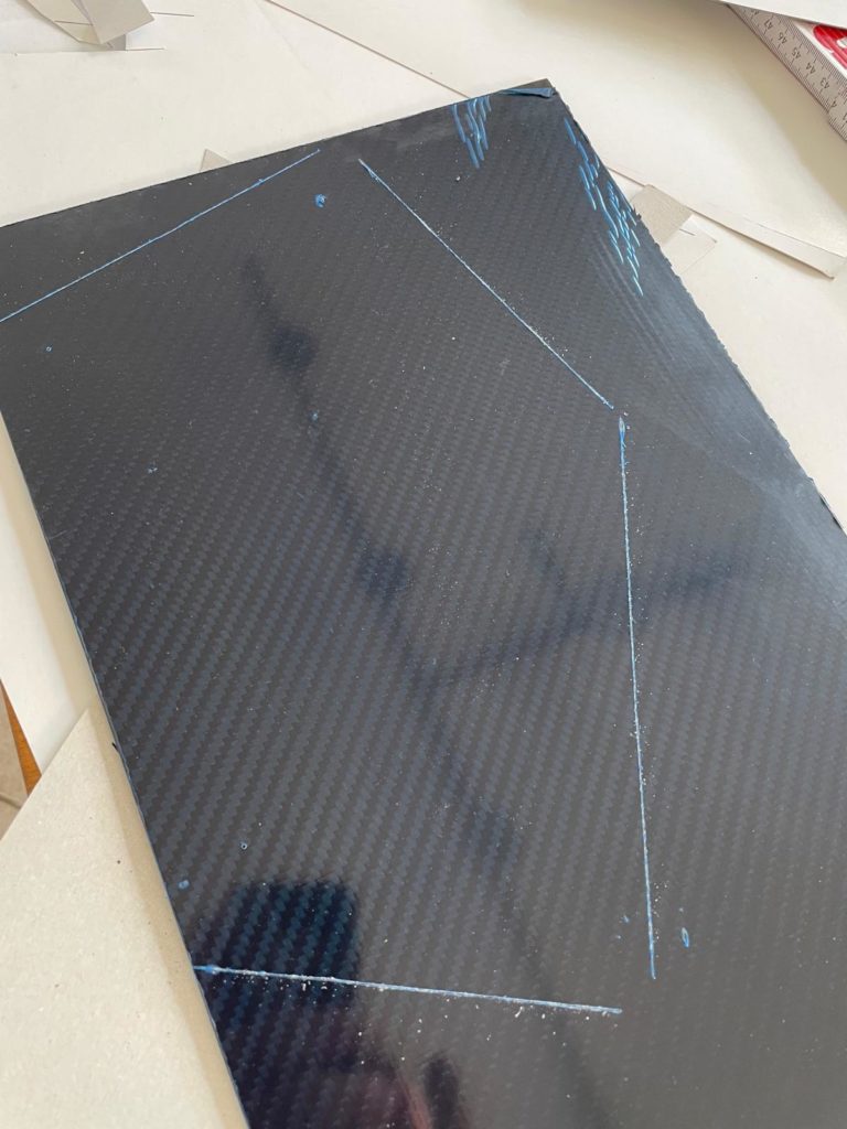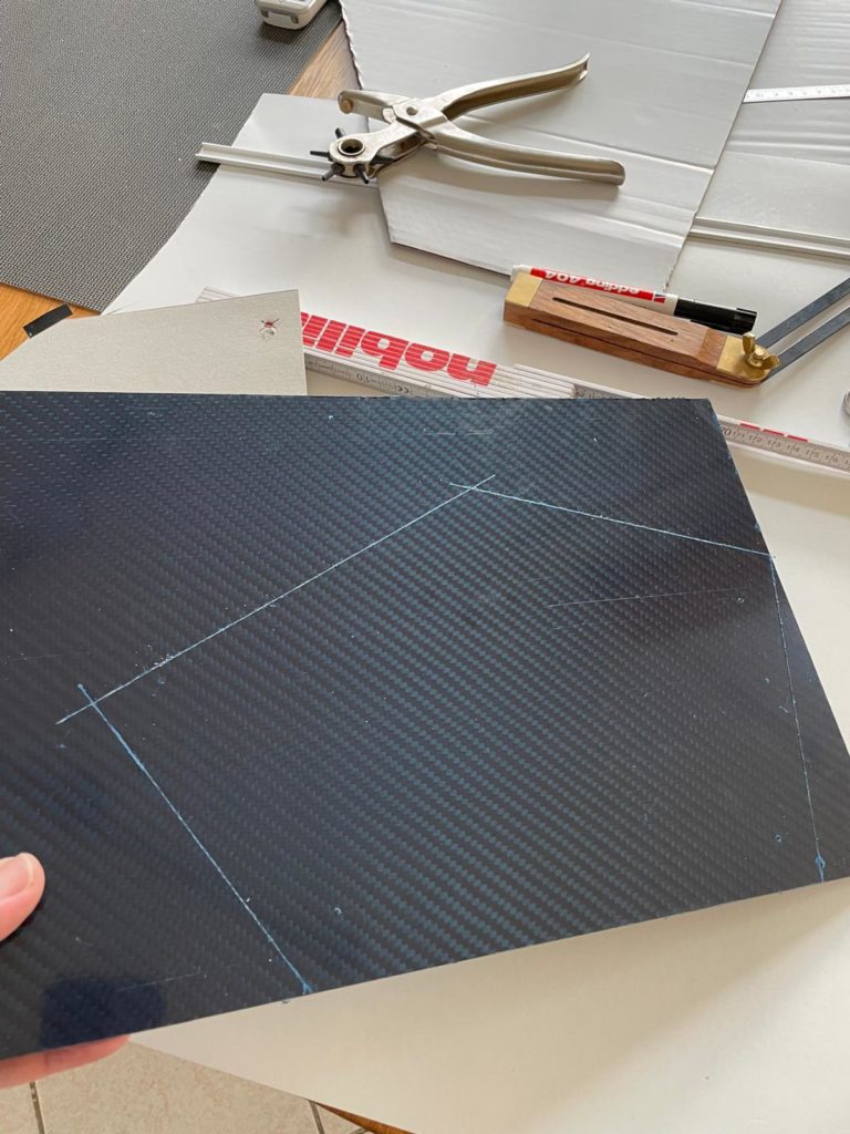 Ich habe mir meine Schmiege geschnappt und begonnen, die Winkel zu bestimmen und die Längen in eine Skitzze zu übertragen. Nun konnte ich mir eine Schablone anfertigen und diese nach überprüfung am Fahrzeug, auf die Carbonplatte übertragen und anreißen.