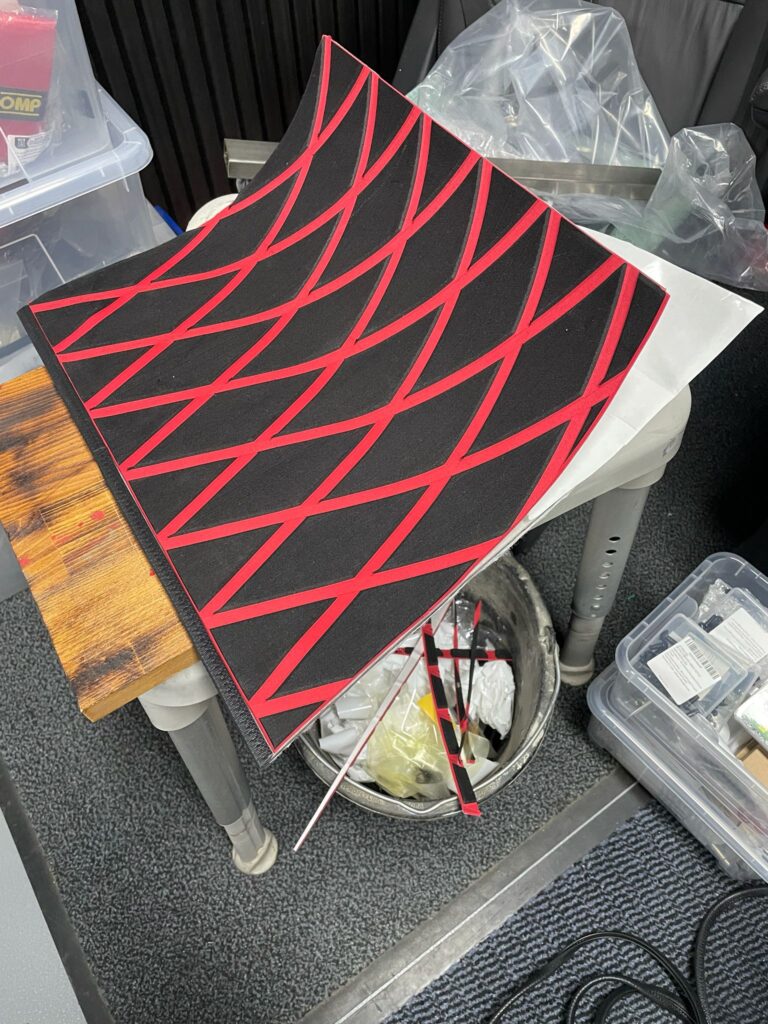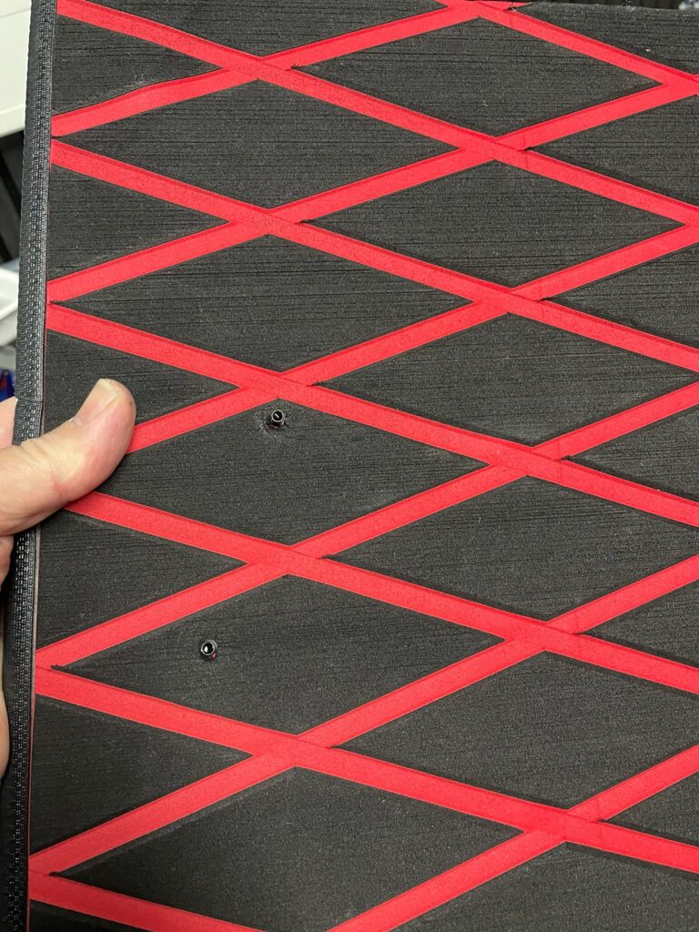 Die Überlegung war Material zu verwenden, welches wasserfest ist und strapzierfähig. Ein Belag für Boote verspricht hier eine gute Wahl zu sein. Es handelt sich um EVA-Schaum welcher selbstklebend ist und sich sehr gut mit dem Messer schneiden lässt. Die Farbauswahl ist üppig , es gibt verschiedene Kombinationen. schwarz/rot, schwarz/gelb, schwarz/blau, schwarz/grün oder einfarbig schwarz, grau, blau