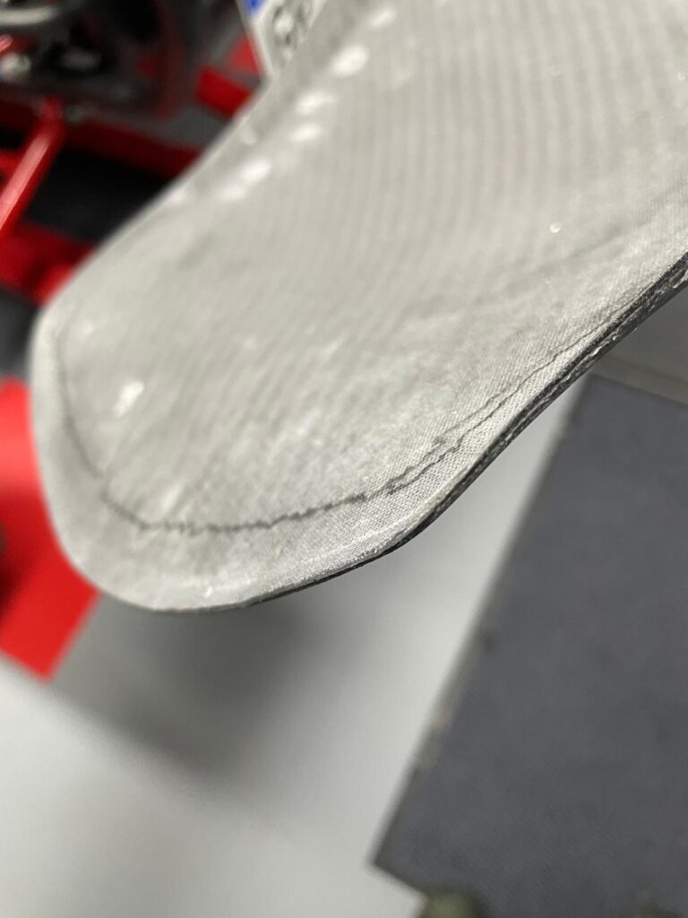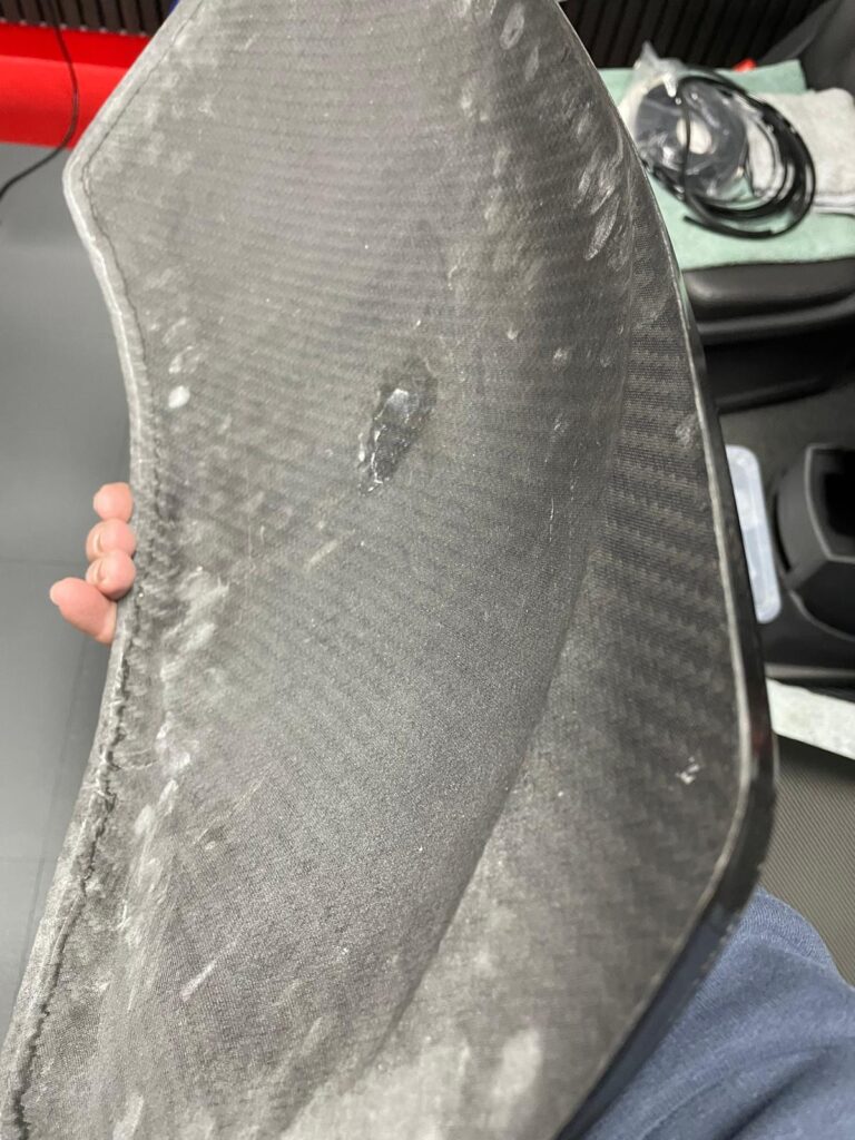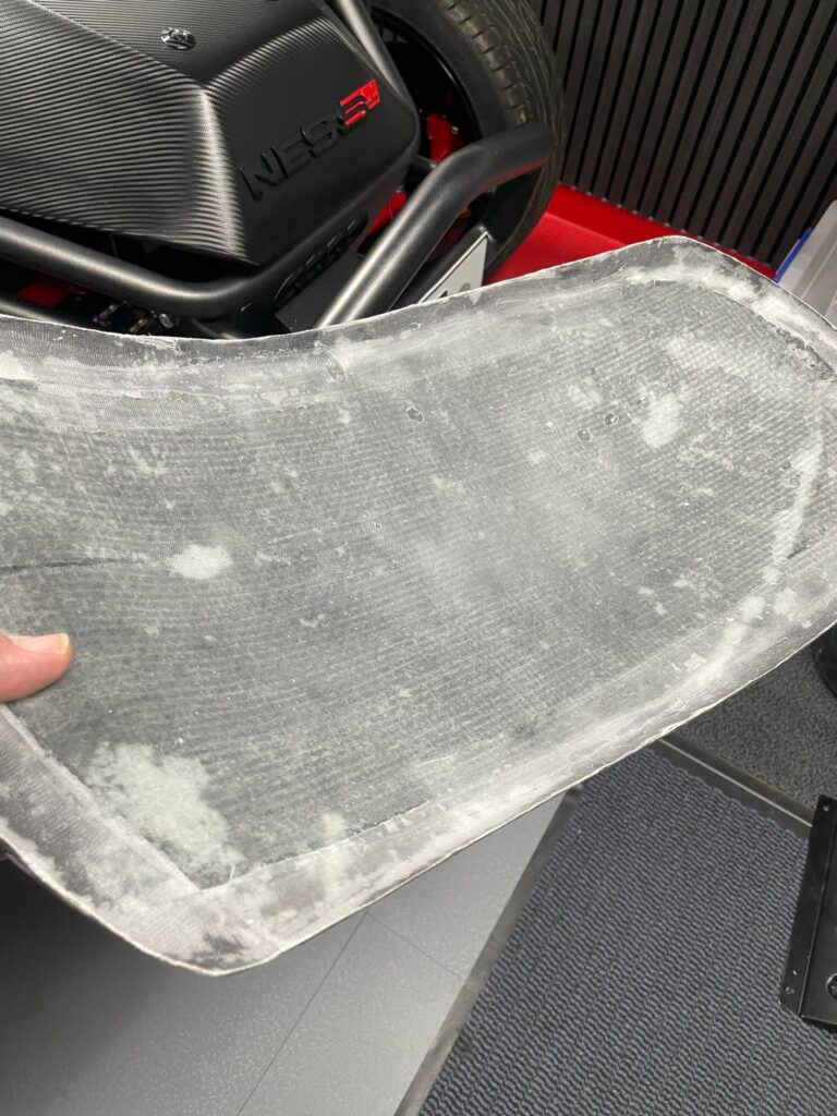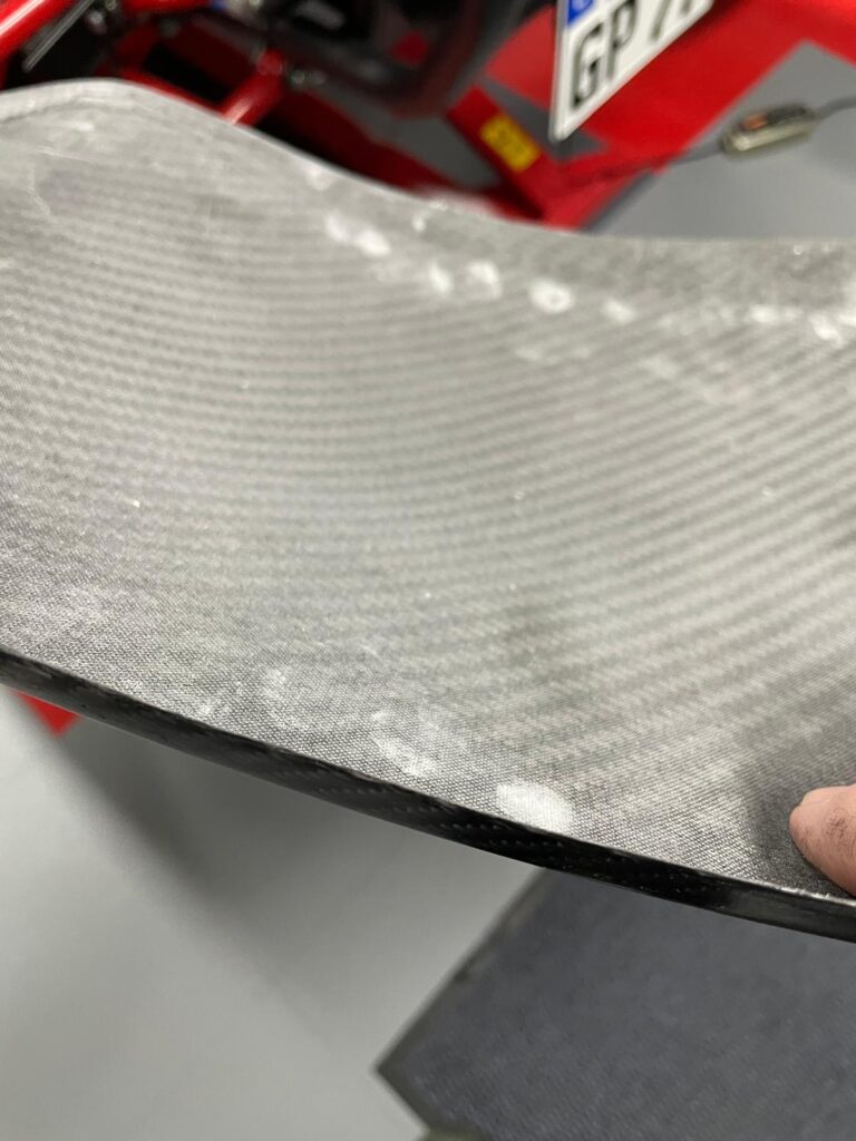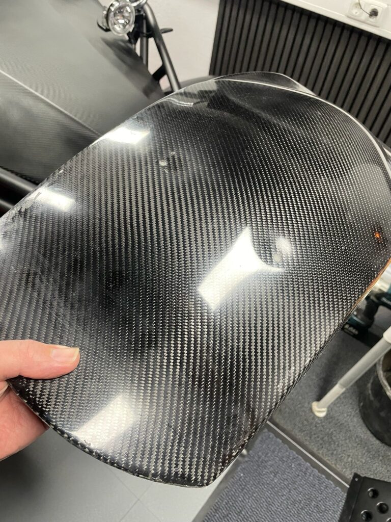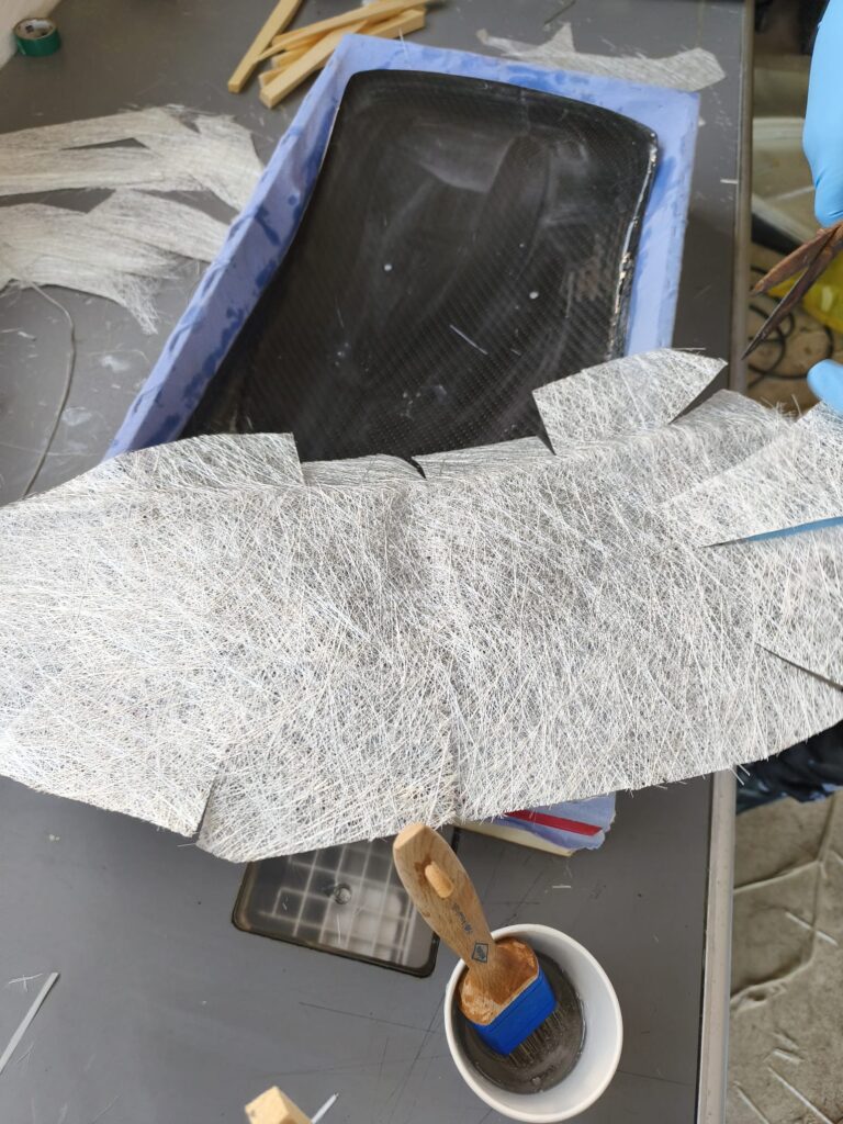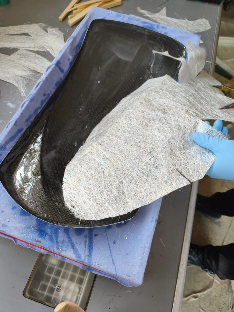 Die Carbon-Fender sind für die Montage aktuell noch nicht stabil genug. Die vorhandene Lage Carbonmatte ist zu dünn und soll daher mit zusätzlichen Armierungsmatten und Epoxidharz verstärkt werden.