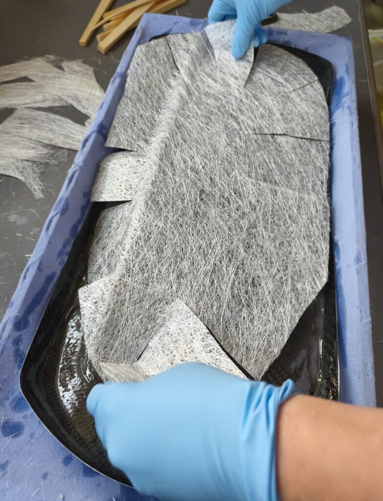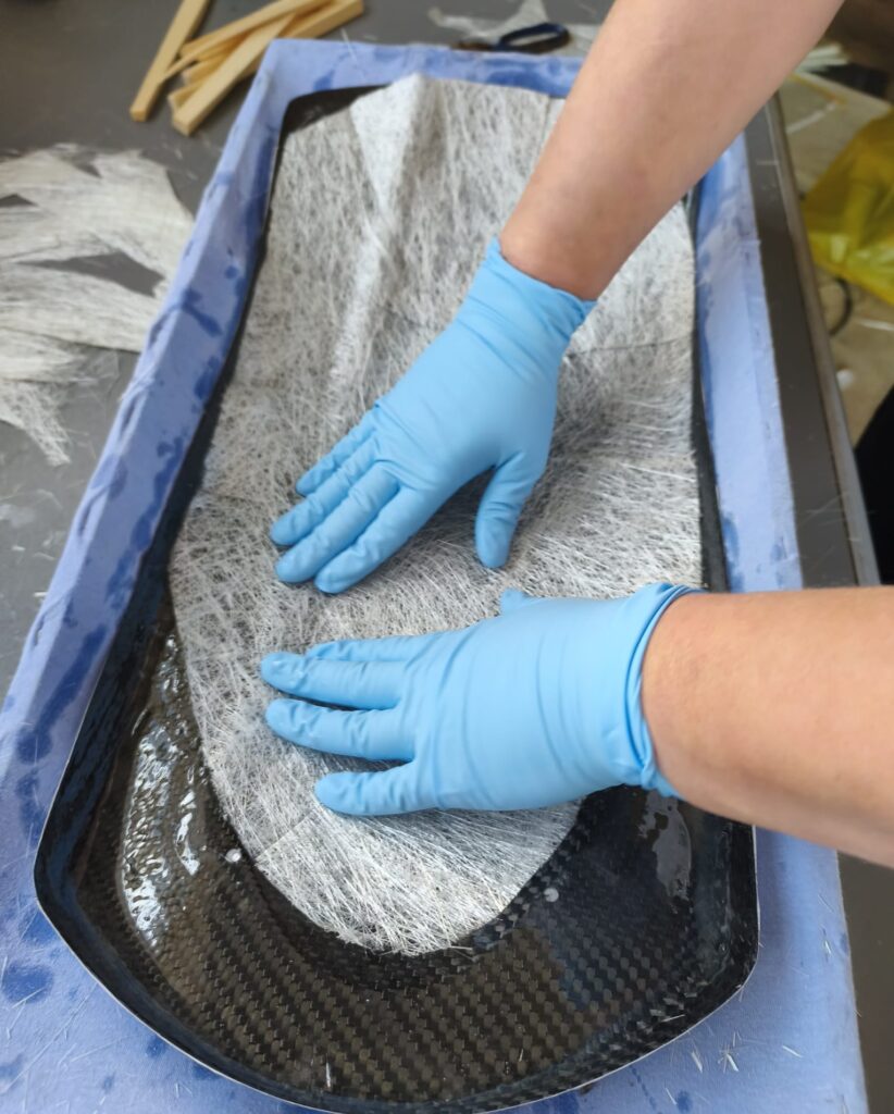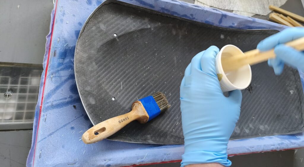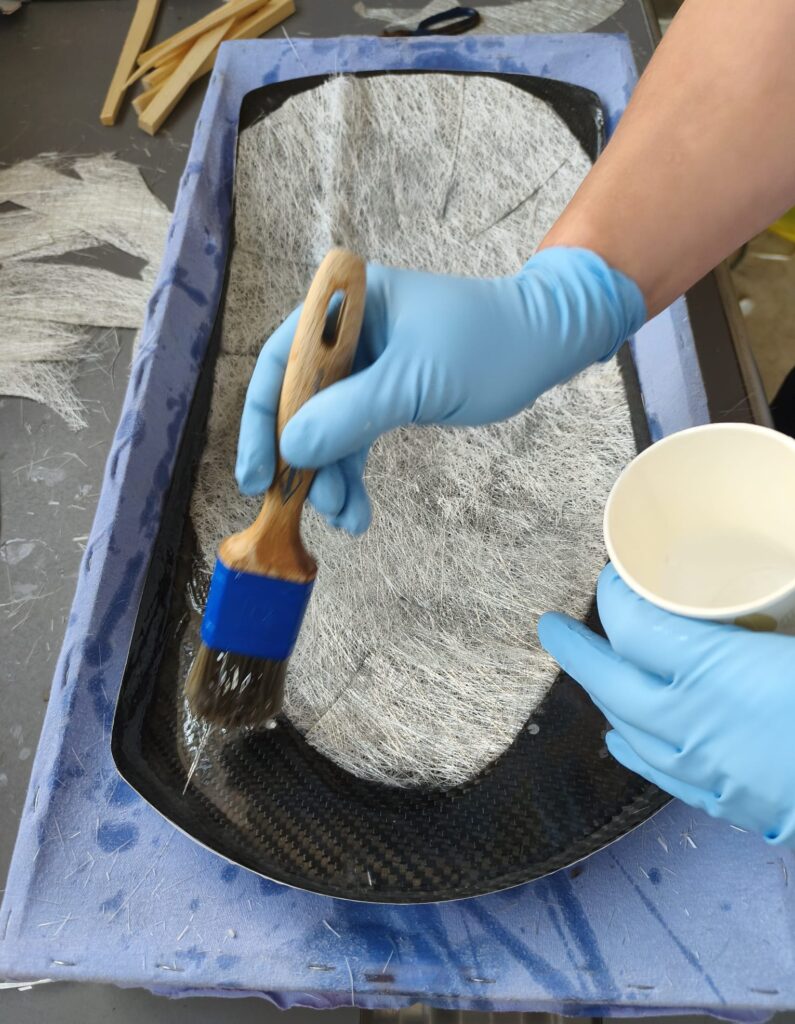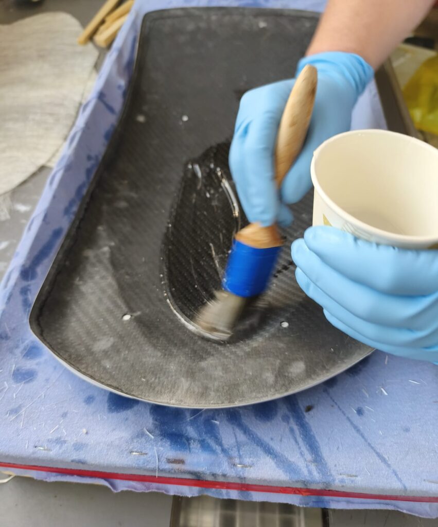 Es ist sehr wichtig das Mischungsverhältnis einzuhalten! Den angemischten Harz aufzutragen und die erste Lage Matte einzubetten und satt mit Harz zu tränken. Die unter der Matte eingeschlossene Luft gut ausstreichen, es wird oft auch eine kleine Rolle benutzt, um so eine gute Verbindung zum Untergrund herzustellen, in unserem Fall die Carbon-Fender.