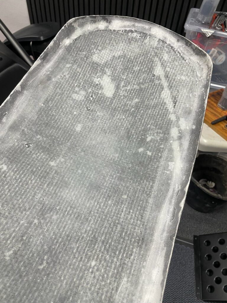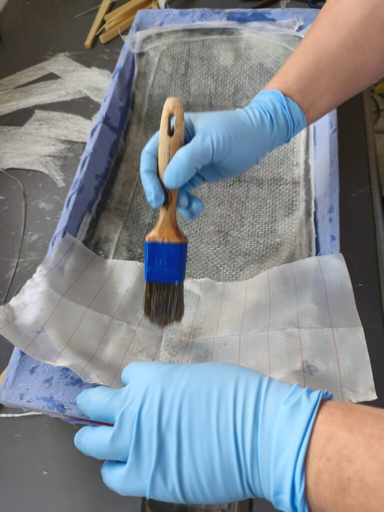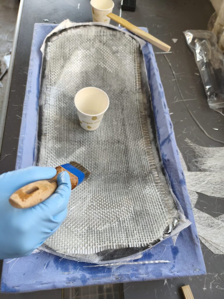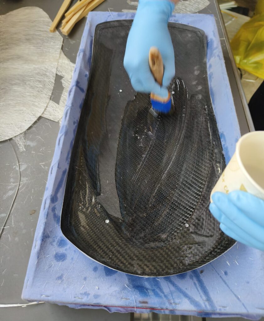 Es ist sehr wichtig das Mischungsverhältnis einzuhalten! Den angemischten Harz aufzutragen und die erste Lage Matte einzubetten und satt mit Harz zu tränken. Die unter der Matte eingeschlossene Luft gut ausstreichen, es wird oft auch eine kleine Rolle benutzt, um so eine gute Verbindung zum Untergrund herzustellen, in unserem Fall die Carbon-Fender.
