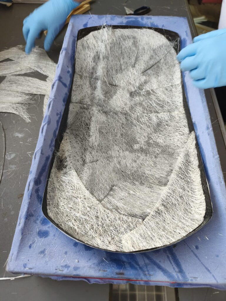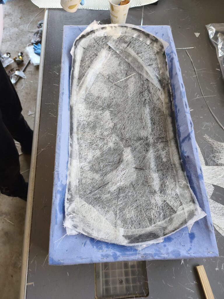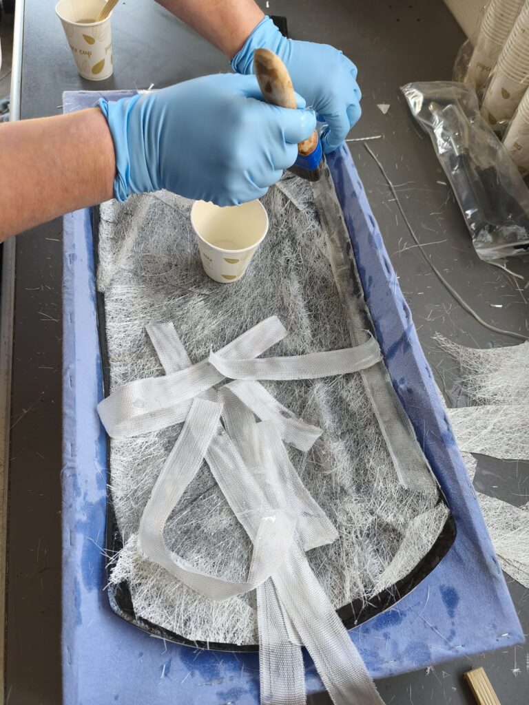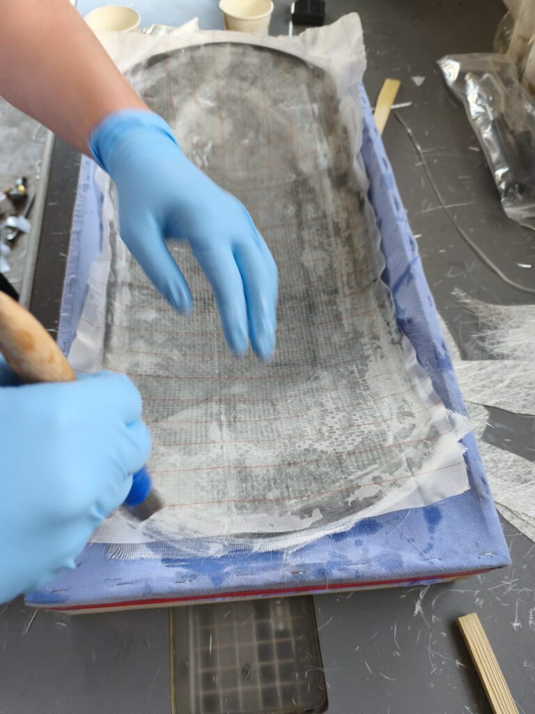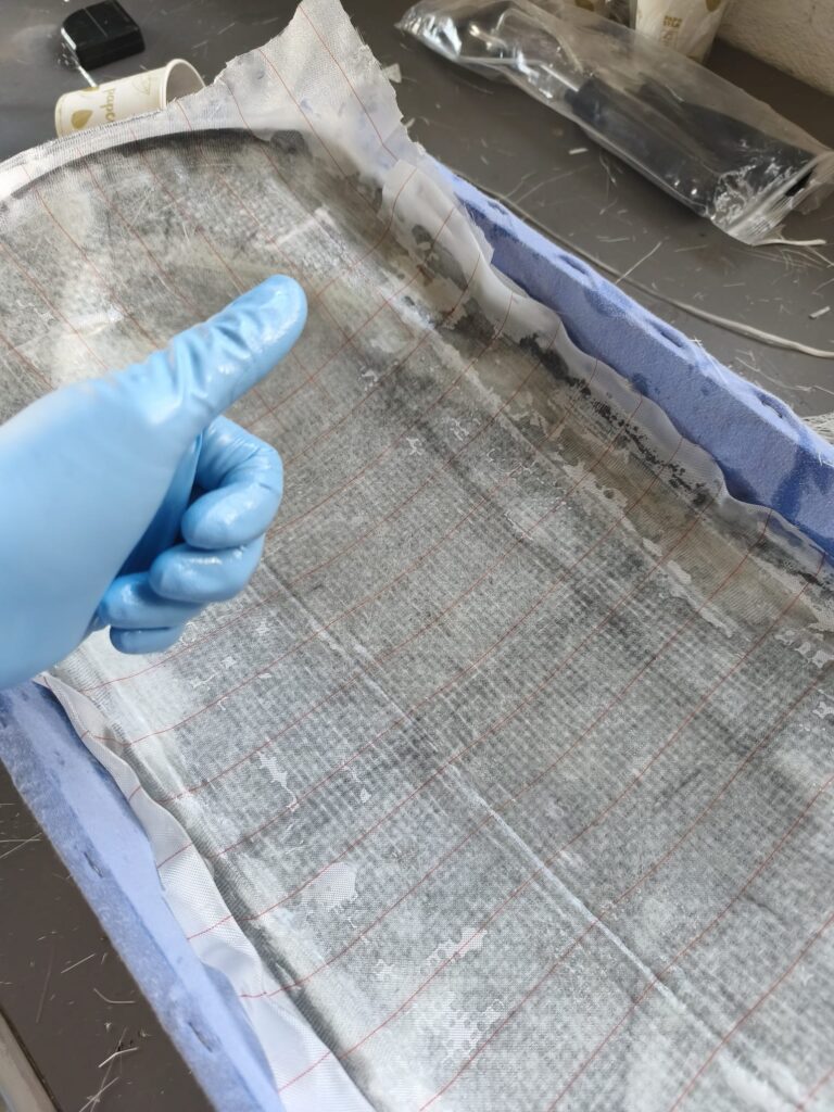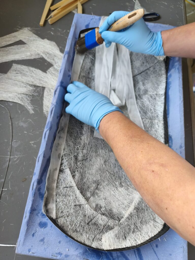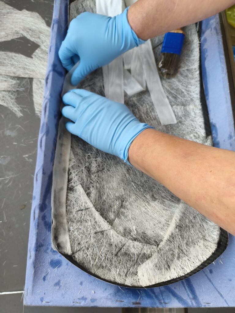 Die erste Schicht ist nun aufgebracht, auf geht es zur zweiten Lage, welche in meinem Fall die starke Matte ist um die Stabilität zu bekommen. Die Ränder wurden mit schmalen 30mm Gewebestreifen ausgelegt, da sich die große Matte nicht bis in den Rand formen lässt.
