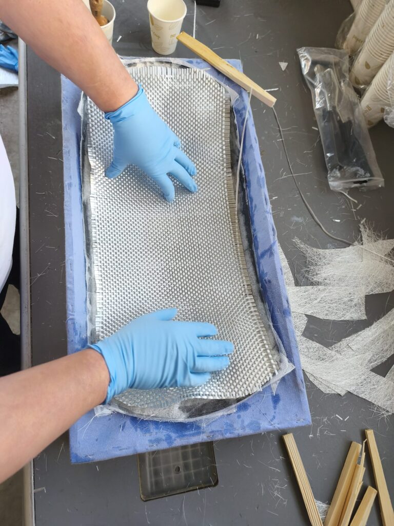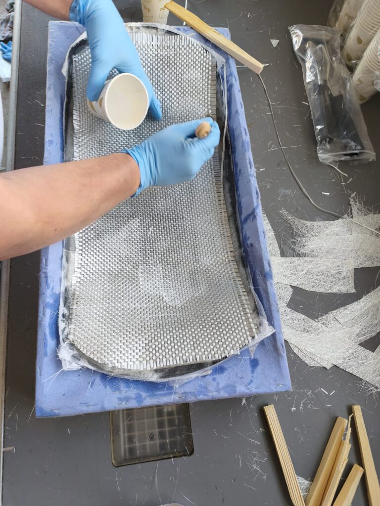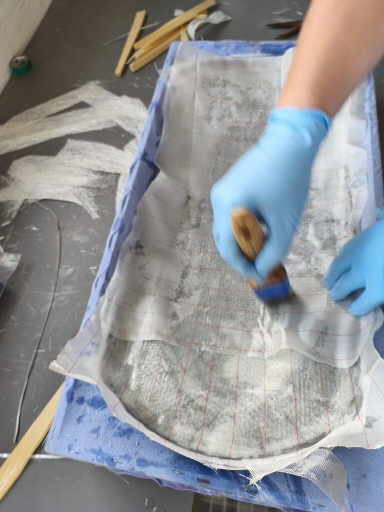 Anschließend werden die Matten mit einem Harz-Härter-Gemisch getränkt und mit einer Hartrolle aufgebracht. Durch das gleichmäßige andrücken wird eingeschlossene Luft zwischen den Lagen herausgedrückt, sodass eine feste und belastbare Verbindung entsteht.