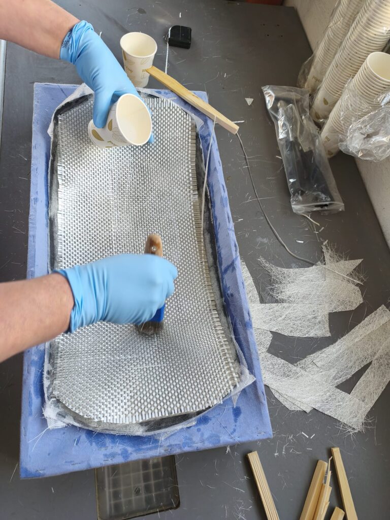 Als nächster Schritt, werden die Matten zurecht geschnitten und alles griffbereit zurecht gelegt. Wir haben uns für ein Glasfasergewebe 300g/m² , ein Rovinggewebe 600g/m³ und für die Ränder ein 30mm Gewebeband aus Glasfaser endschieden.