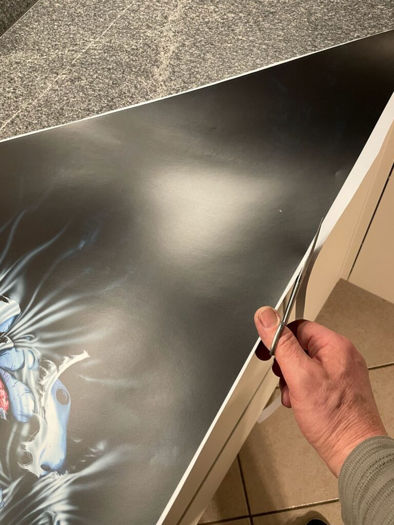 Die Dekore für beide Seiten habe ich zunächst grob zugeschnitten. Anschließend wurden die zu folierenden Flächen gründlich gereinigt und zusätzlich mit Silikonentferner entfettet, damit die Folie optimal haftet.