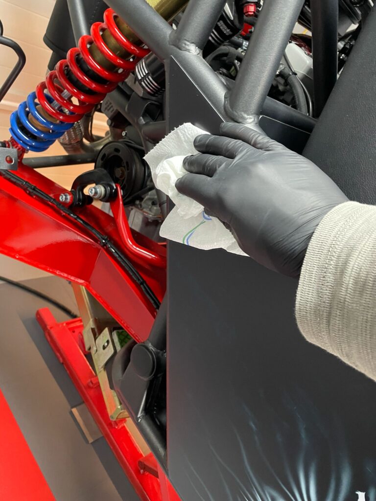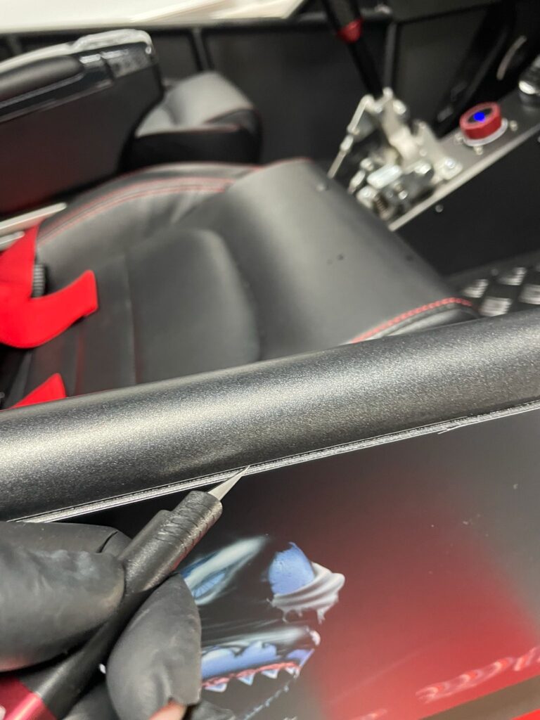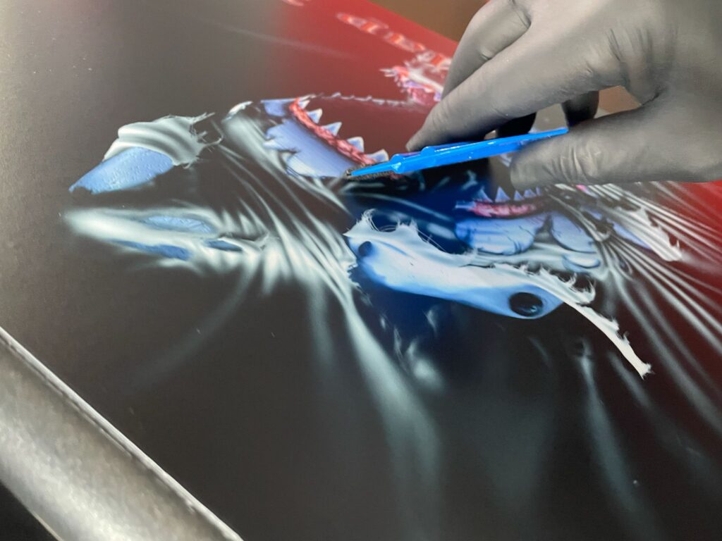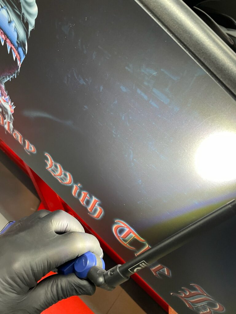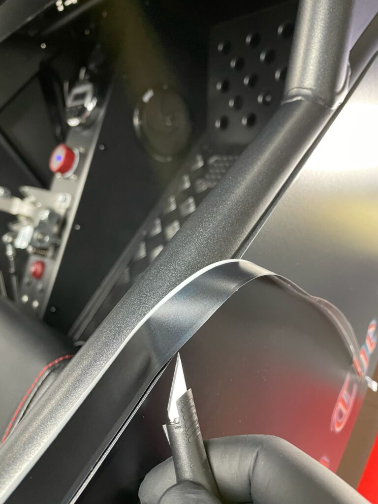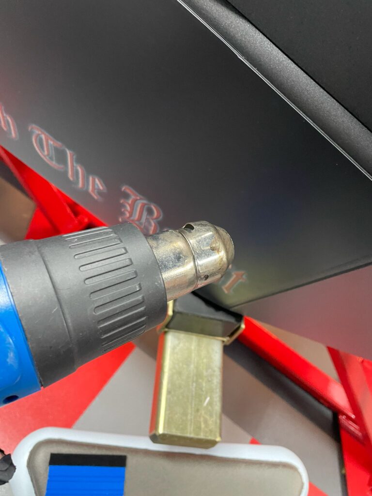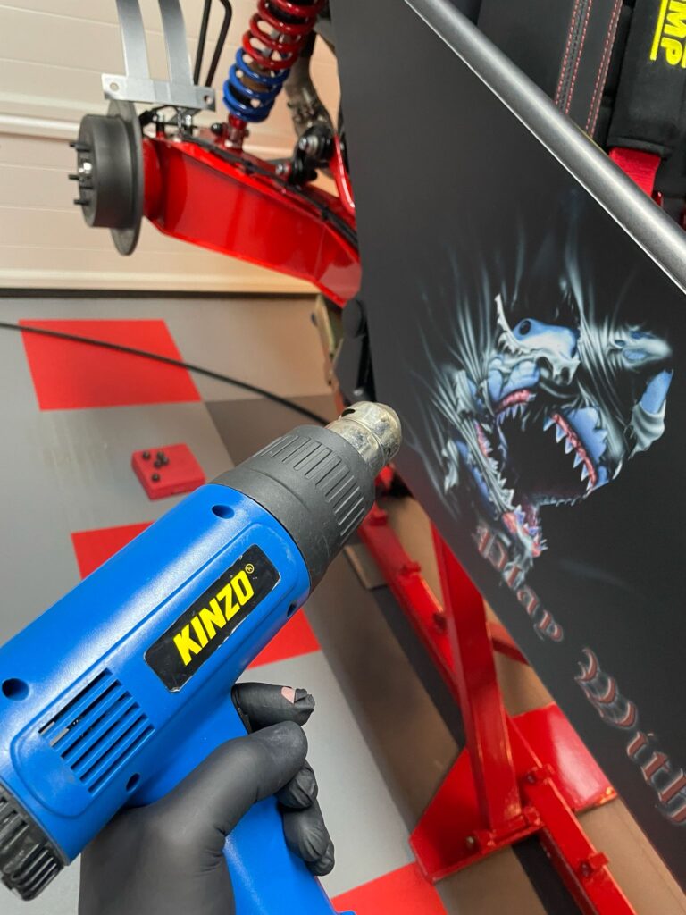 Mit einer Heißluftpistole habe ich die Folie anschließend vorsichtig erwärmt, um den Kleber zu aktivieren. Dieser Arbeitsschritt wird als Tempern bezeichnet. Dabei wird die Folie nicht nur besser fixiert, sondern gleichzeitig entspannt, sodass sie sich dauerhaft an die Konturen anpasst.