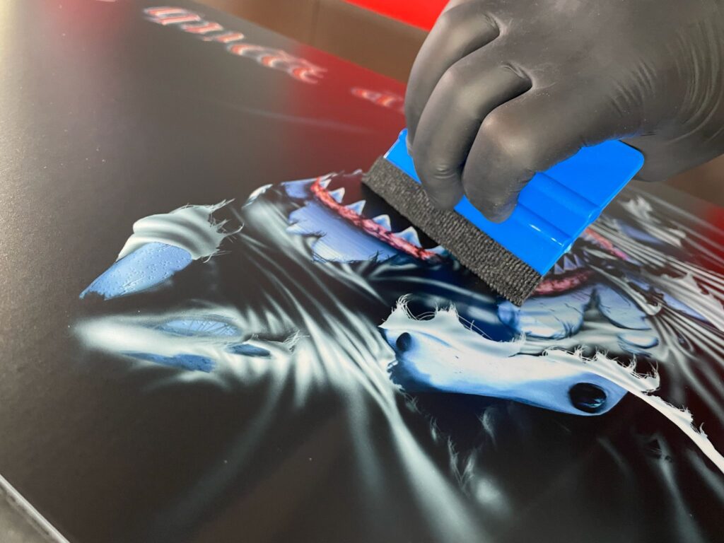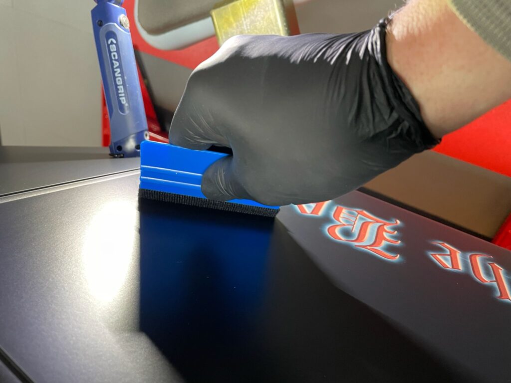 Nach dem ich die richtige Position gefunden hatte, habe ich von der Mitte aus die Folie mit dem Rakel ausgestrichen. Dabei hat sich der Wasserfilm an den Kanten rausgedrückt und die Haftung der Folie wurde stärker. Um keine Blasen zu übersehen, hatte ich mit der Lampe die Fläche überprüft und konnte auch die kleinste Blase erkennen und ausstreichen.