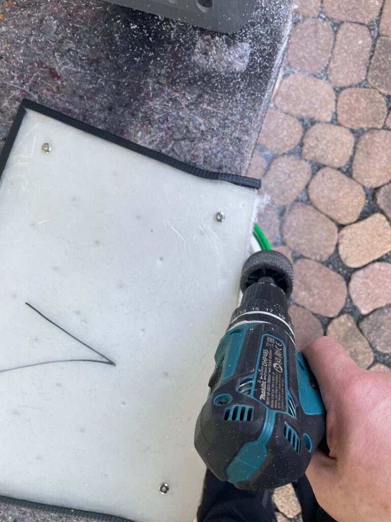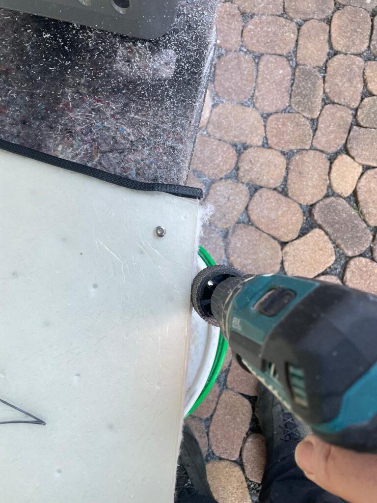 Da nun auch der fehlende Kantenschutz geliefert wurde, kann ich endlich mit der Innenverkleidung weiter machen. Ich habe die Kunstoffplatten nochmal etwas eingepasst, da sie zum Teil etwas zu schwer in die Felder einzulegen gingen. Ein Holzraspel funktionierte super um das Polycarbonat zu bearbeiten.