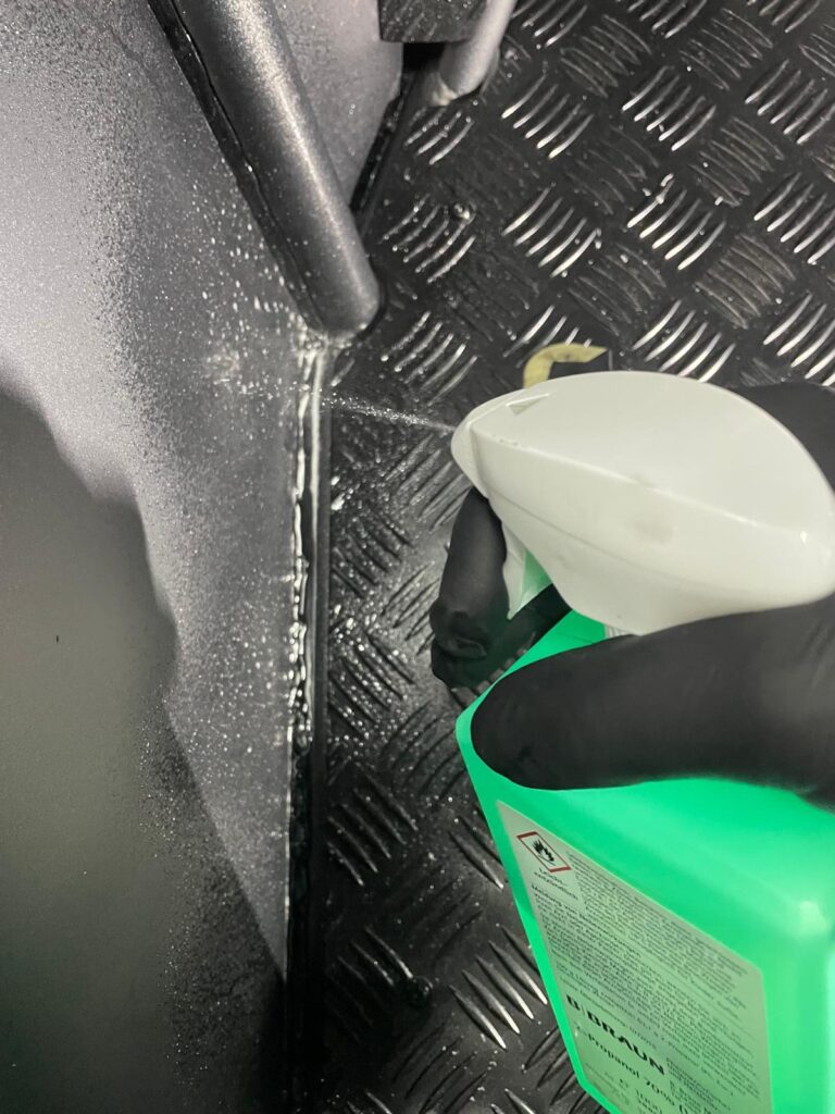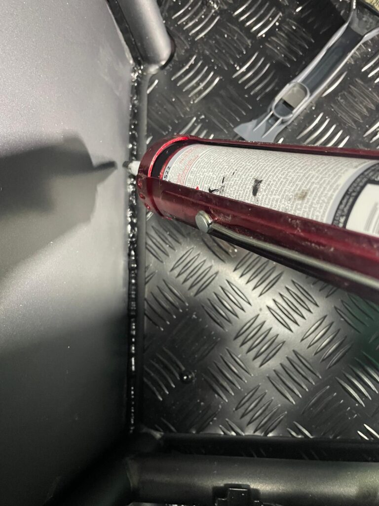 Ich hatte überlegt kleine Löcher unterhalb der Felder zu bohren um einen möglichen Kondenswasser oder ähnliches abzu leiten, habe mich aber für den Karosseriekleber Sikaflex-522 entschieden. Nun kann eintretendes Wasser nicht zwischen Rahmen und Seitenblech ziehen.